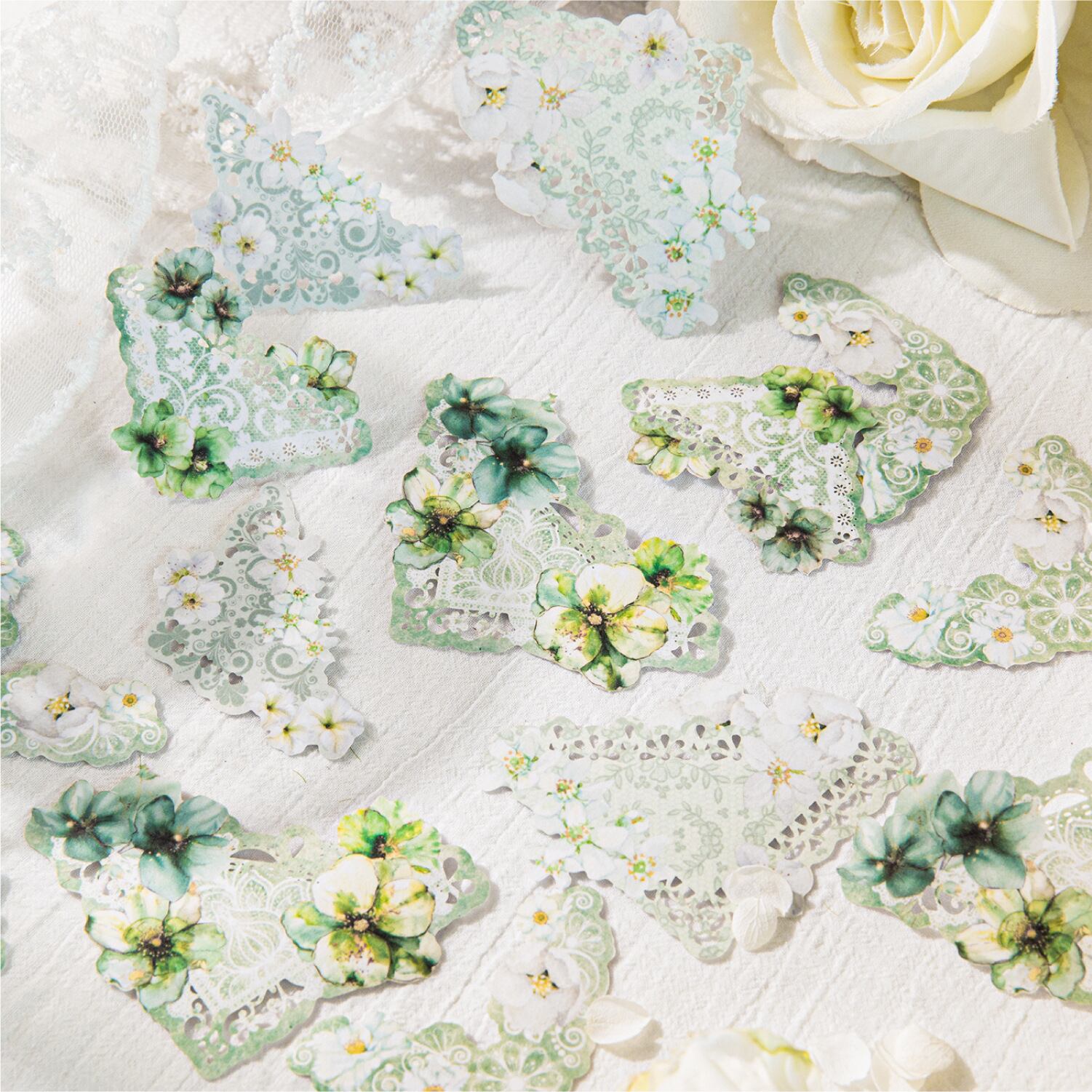 愛らしい花が咲き誇るデザインのシールは、コラージュのコーナー部分を華やかに演出するのにぴったりです。手帳や手紙、カードの装飾など、想像を膨らませて多様なシーンで活用できます。