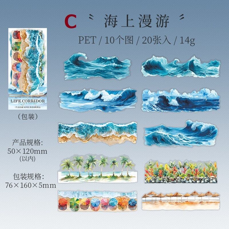 多彩なデザインが描かれた風景シールです。手帳やノートの装飾にぴったりで広がる景色がワンポイントのアクセントになります。