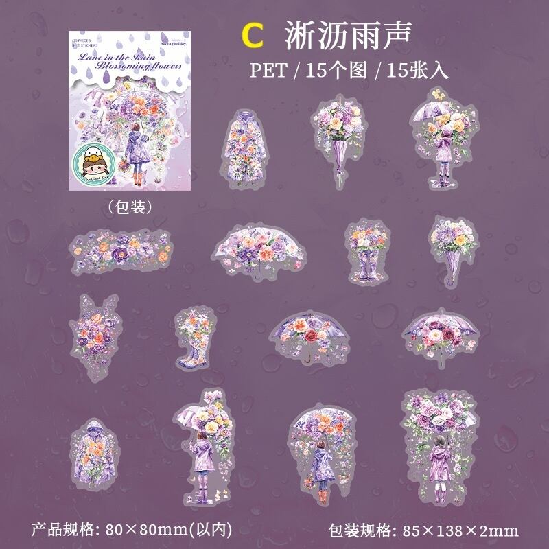 美しい花々が咲き誇るデザインのシールです。雨の中での鮮やかな色彩が魅力で、手帳やラッピング、コラージュに華やかさを添えることができます。便利なサイズ感で、様々な用途にお使いいただけます。