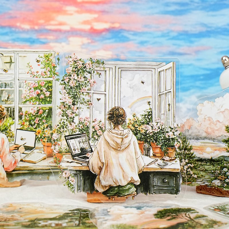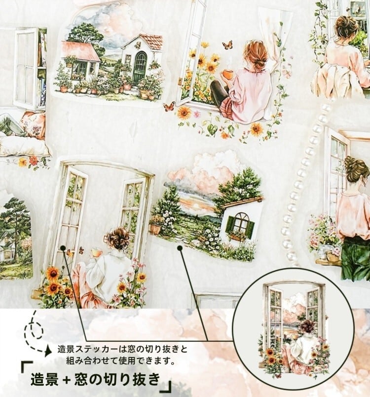 季節や天候によって移り変わる様々な窓辺の風景が、繊細なイラストで描かれているシールです。PET素材なので貼る場所の背景色を選ぶことなく、重ね貼りをして奥行きのあるコラージュ表現をすることも可能です。いつものノートや手帳、ジャンクジャーナルに美しい窓の外の風景をプラスしてお楽しみください。