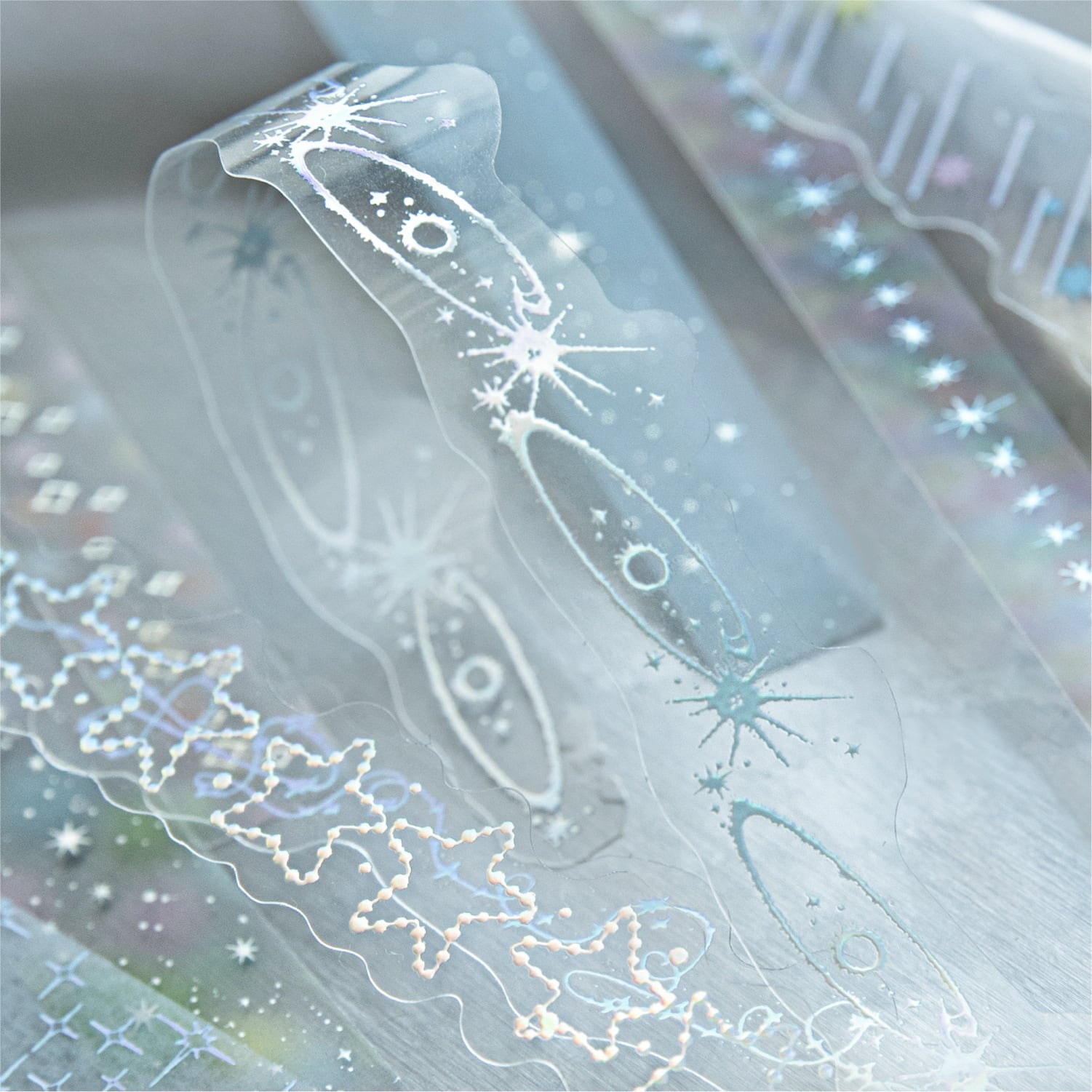 美しい星空や宇宙をテーマにしたPETシールです。透明感のあるPET素材と光に当たると輝くホログラム加工で、様々なシチュエーションに合わせてお使いいただけます。コラージュ素材以外にも、トレカケースのデコレーションやオリジナルグッズ作成にもおすすめです。