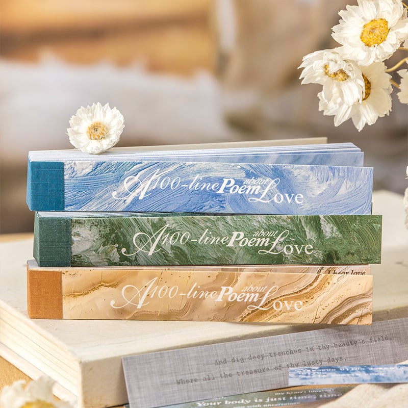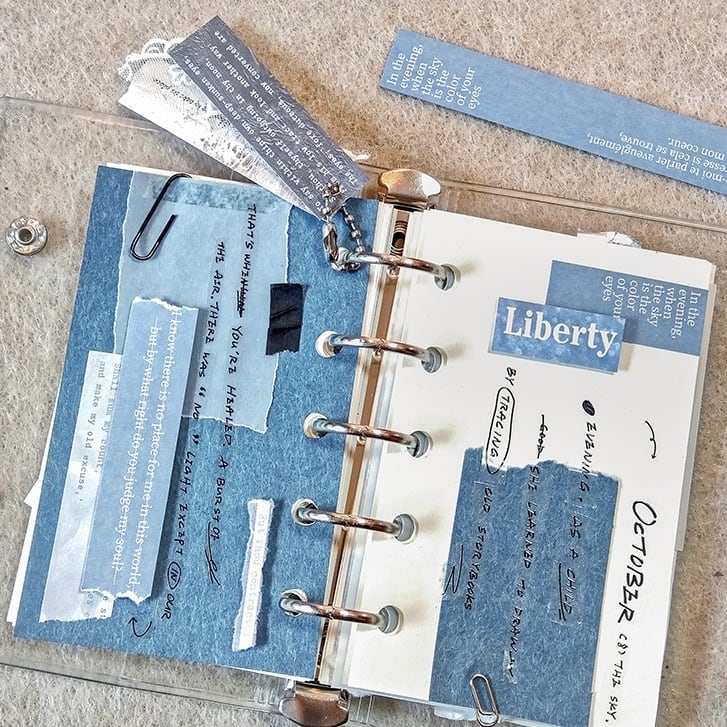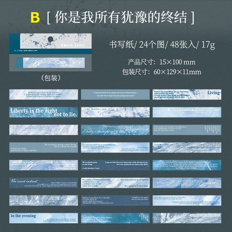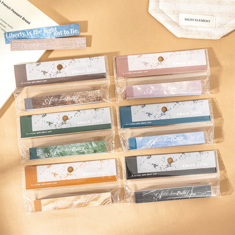 コラージュに使いやすいアーティスティックな英字シールブックです。アンティーク調のデザインと、手書き可能なライティングペーパーの質感が魅力。詩の一節や手紙のようなデザインが、ページに深みと表情を加えてくれる素敵な商品です。
