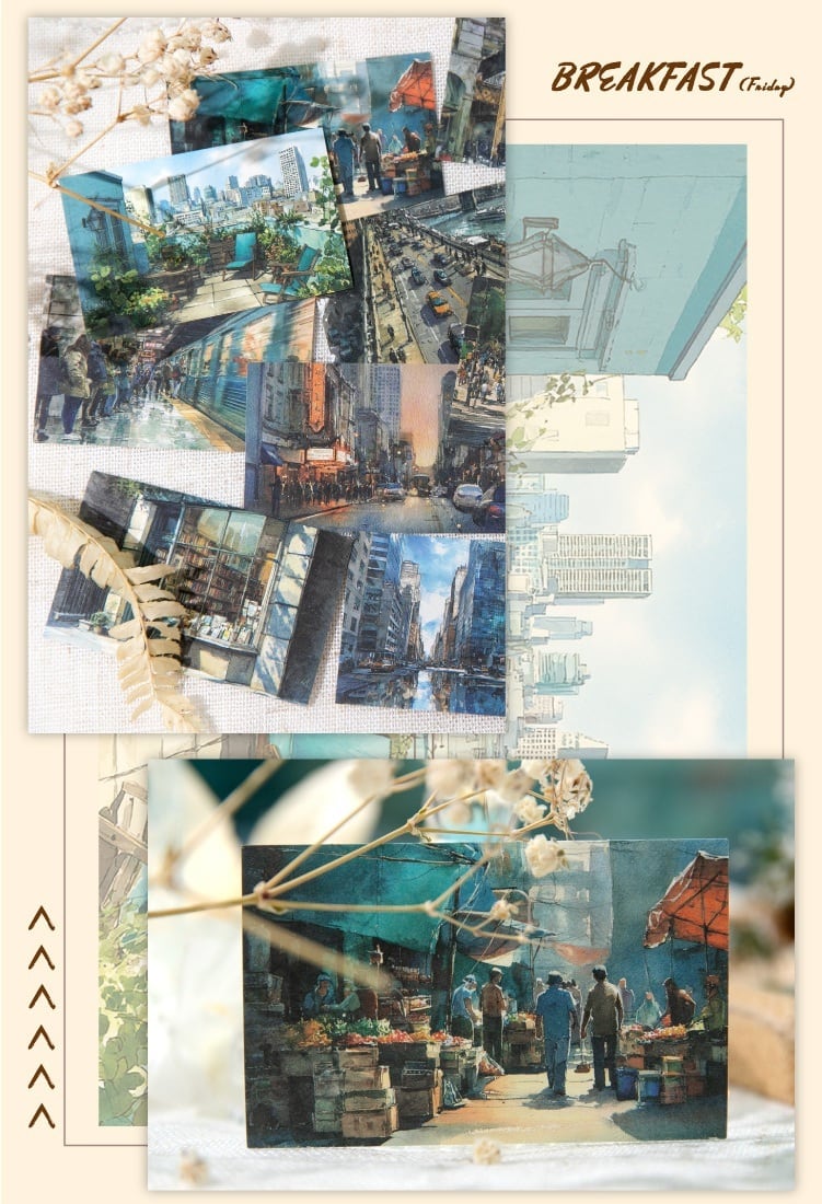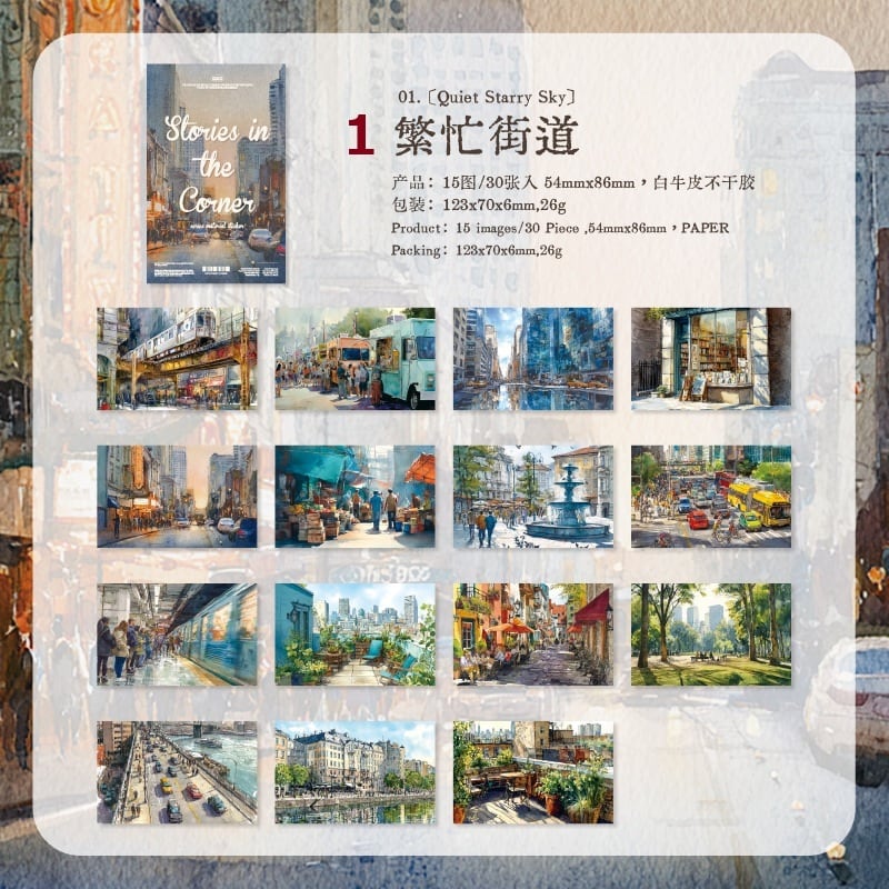 心惹かれる街角の風景を切り取ったシールです。まるで映画のワンシーンのようなノスタルジックで美しいイラストが特徴。柔らかな光が差し込む街並みなど、一つひとつのデザインに小さな物語が宿っています。コラージュの背景紙や、アクセントとしてお楽しみいただけます。