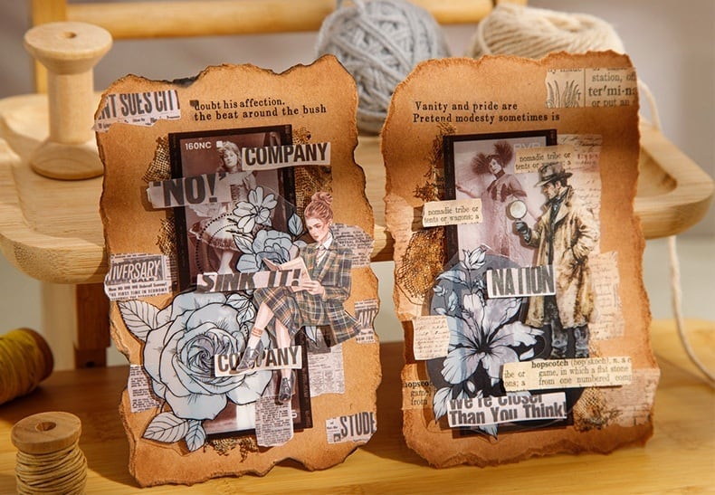 まるで古い洋書や新聞から切り取ったかのような味わい深いデザインのシールです。剥離紙付きのダイカットタイプなので、はさみを使う手間もなく、必要な時にさっと剥がして使えます。ジャンクジャーナルやスクラップブッキング、DIYの小物アレンジなど、幅広くお使いいただけます。