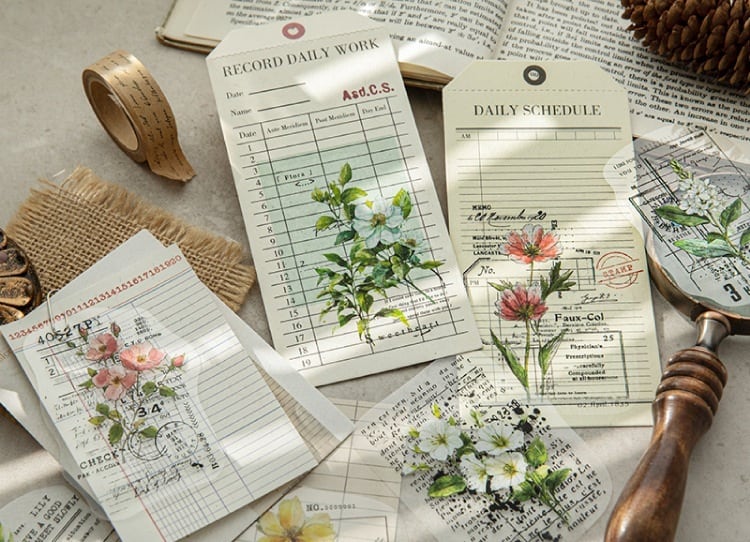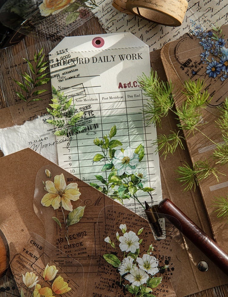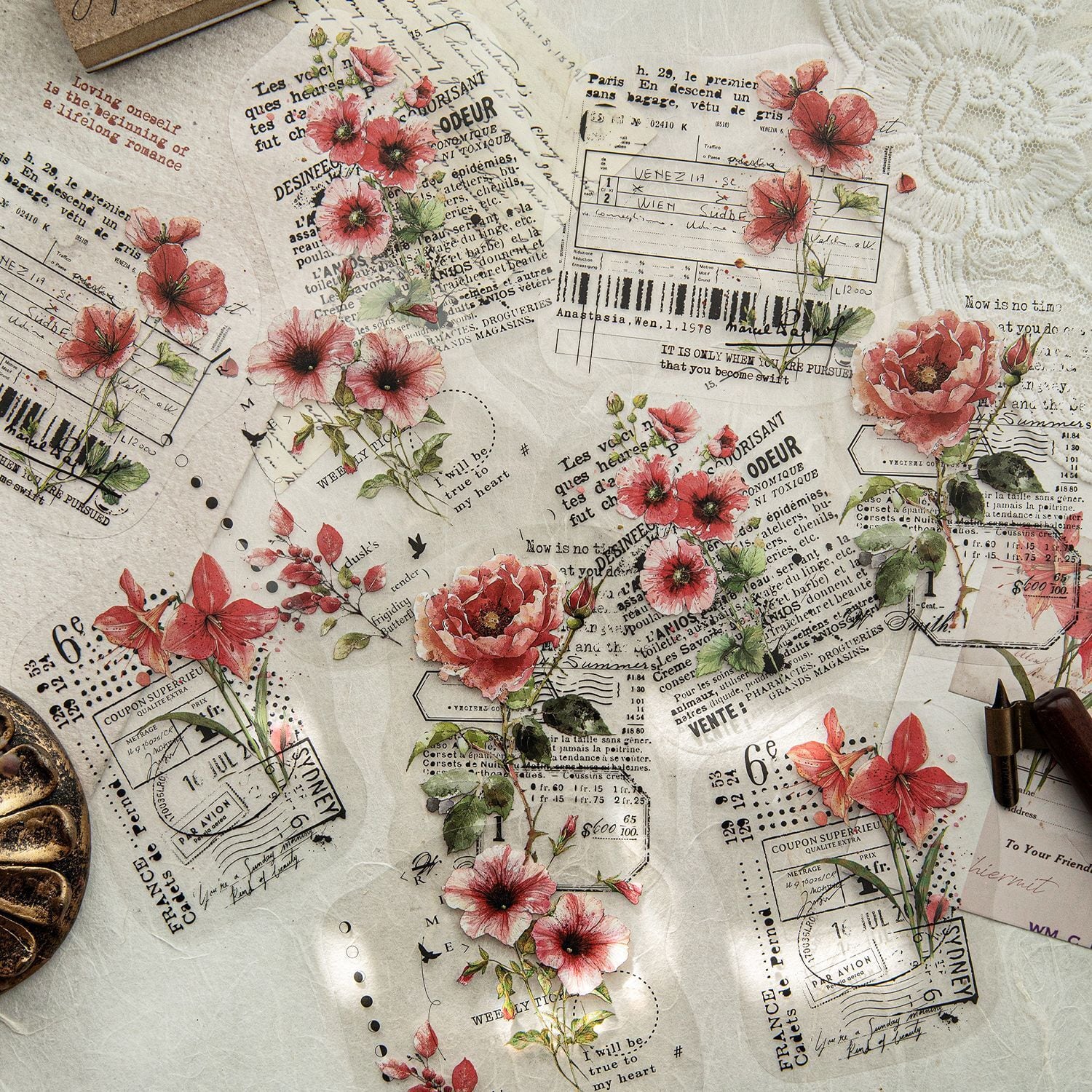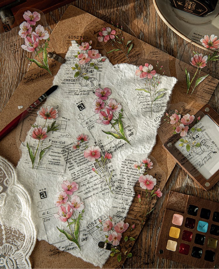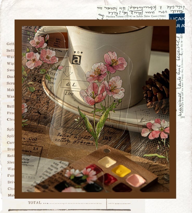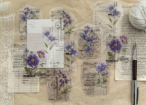 繊細なボタニカルアートとアンティーク調の文字を組み合わせたシールです。草花のイラストはやさしい色合いで描かれており、ノスタルジックで温かみのある雰囲気を演出します。ジャンクジャーナル、スクラップブッキング、手帳デコ、ラッピング、カード作りなど、さまざまなクラフトシーンで活躍。組み合わせ次第で作品の表情がぐっと広がります。自然モチーフやレトロな世界観がお好きな方、コラージュ素材を集めている方におすすめの商品です。