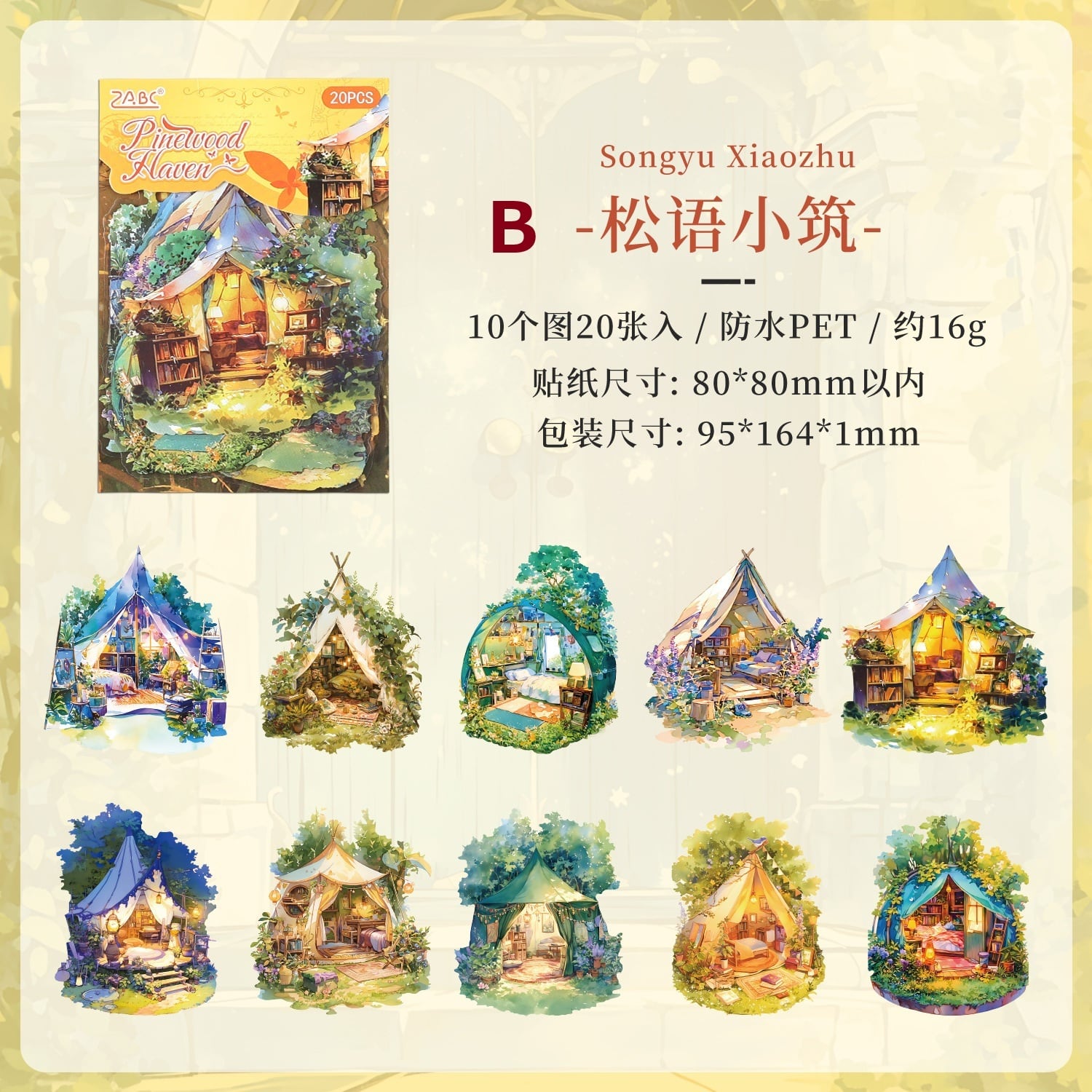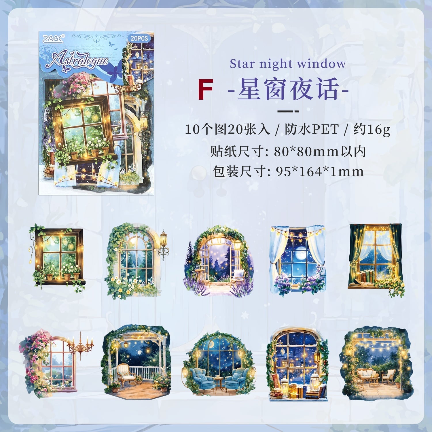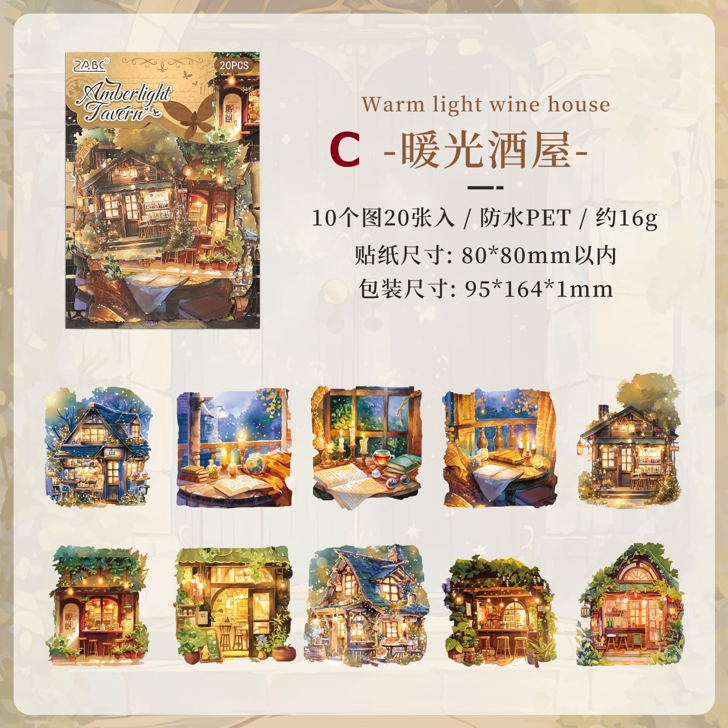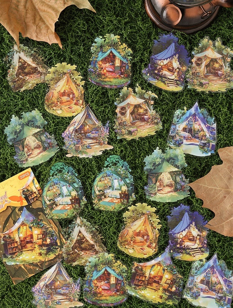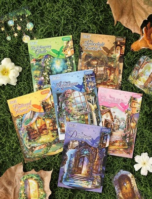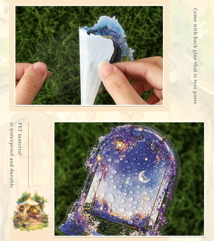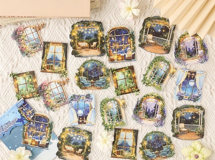 まるで旅の途中で出会った小さな物語のかけらのような、あたたかな灯りに包まれた家々や、静かな夜の書斎、物語が始まりそうな窓辺の風景が描かれた幻想的なPETシールです。やわらかな色合いと、絵本のような世界観が魅力。PET素材ならではのほどよい透け感があり、重ね貼りしても雰囲気を損なわず、ページに自然となじみます。