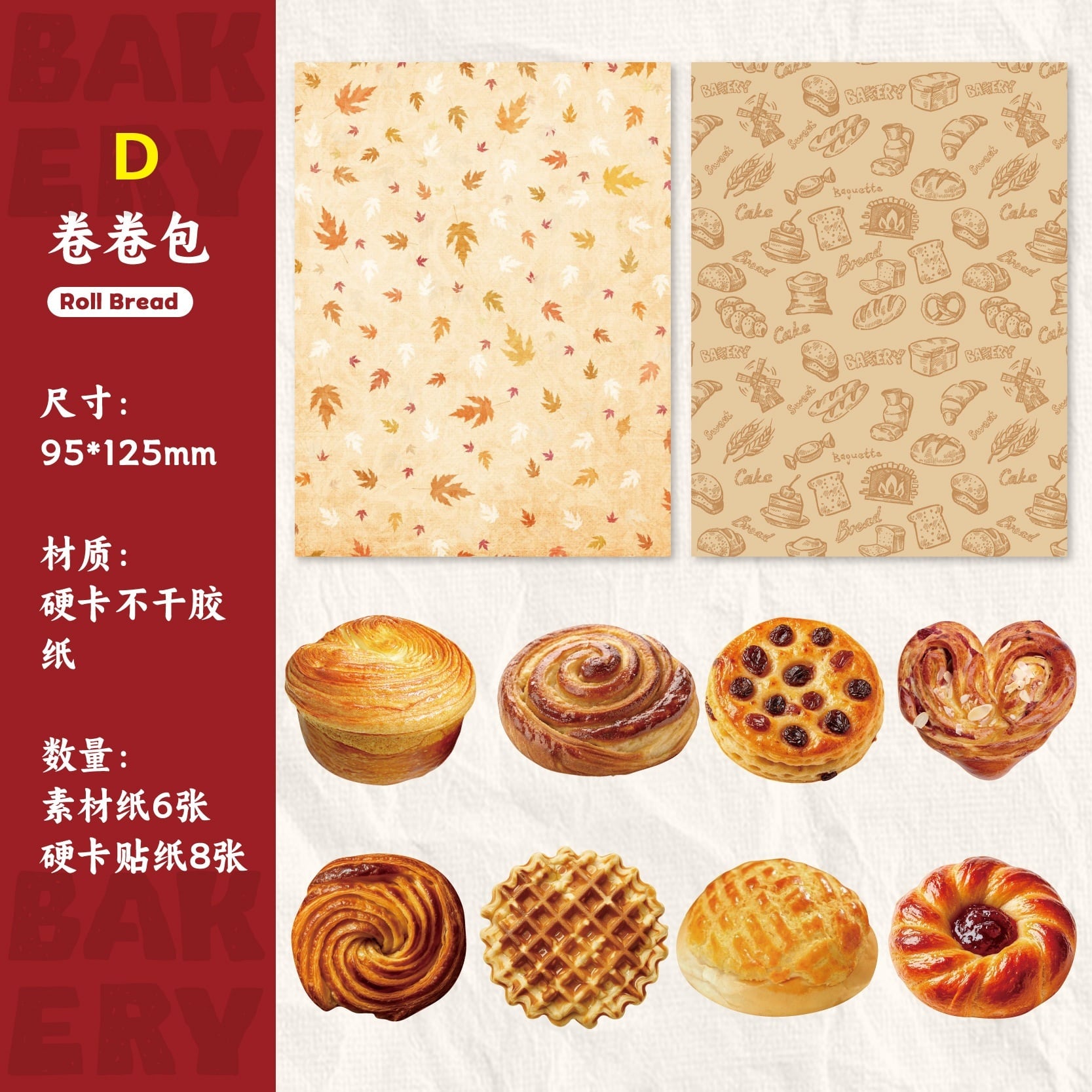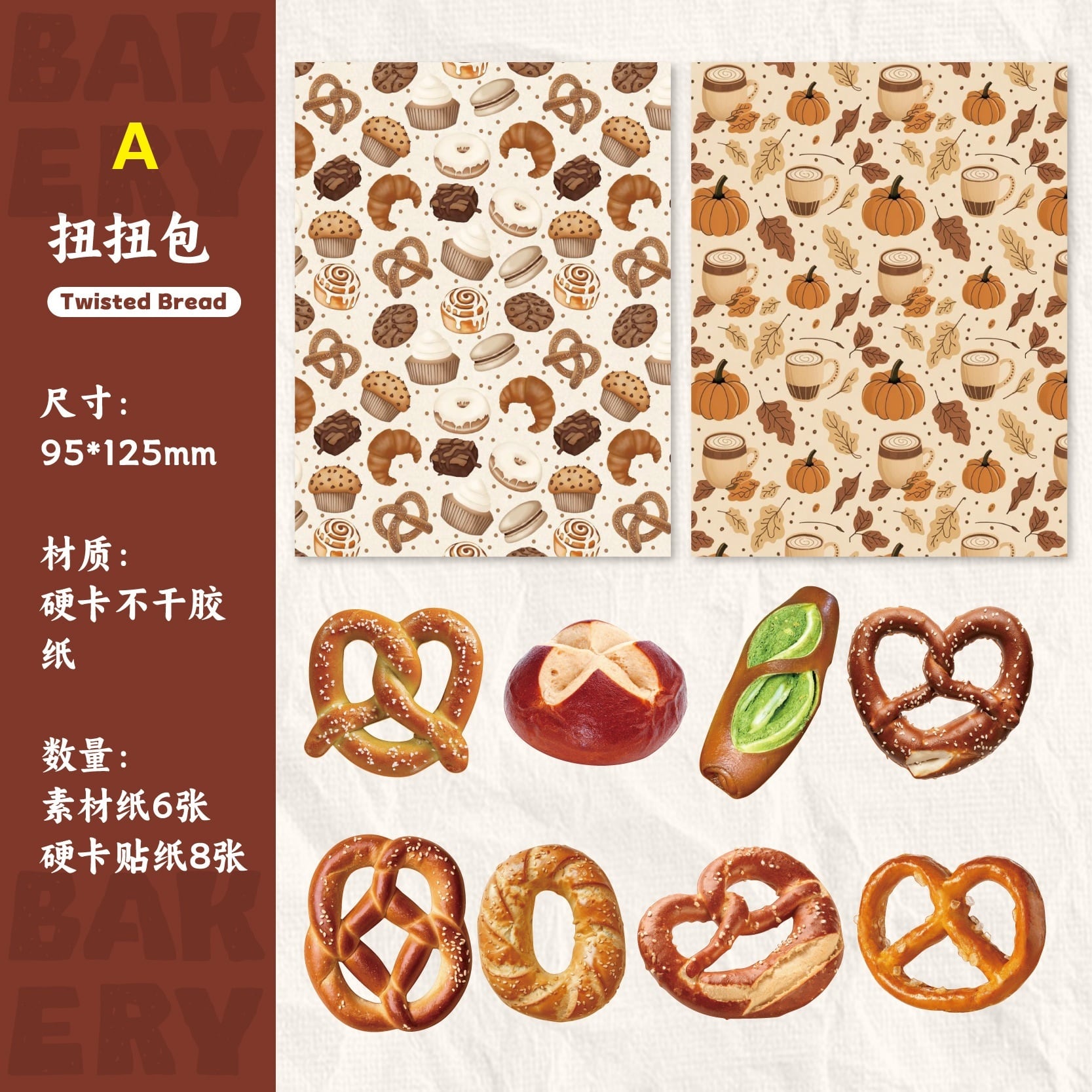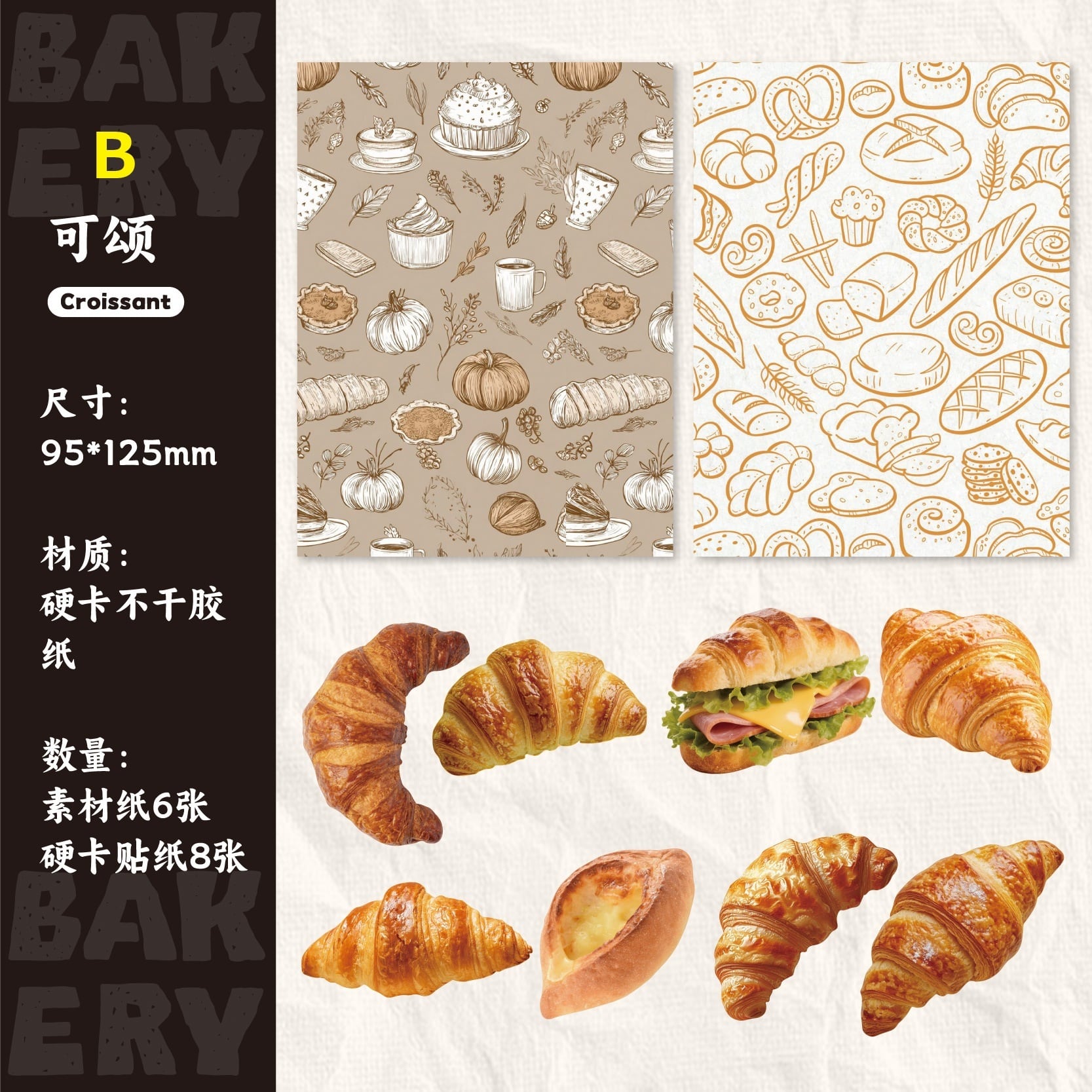 パン屋さんをテーマにしたコラージュ素材セットです。クロワッサンやプレッツェル、焼き菓子など、ベーカリーをモチーフにしたイラストを中心に、あたたかみのあるレトロな雰囲気に仕上げられています。落ち着いた色合いで、手帳デコやコラージュに取り入れやすく、ページ全体にやさしいアクセントを加えてくれます。シール部分には硬質ペーパー素材を使用しており、しっかりとした質感で貼った際の存在感もあります。素材紙と組み合わせて使うことで、ジャンクジャーナルやスクラップブッキング、ラッピング装飾など、幅広いアレンジをお楽しみいただけます。海外紙ものやベーカリー・スイーツモチーフがお好きな方におすすめの素材セットです。