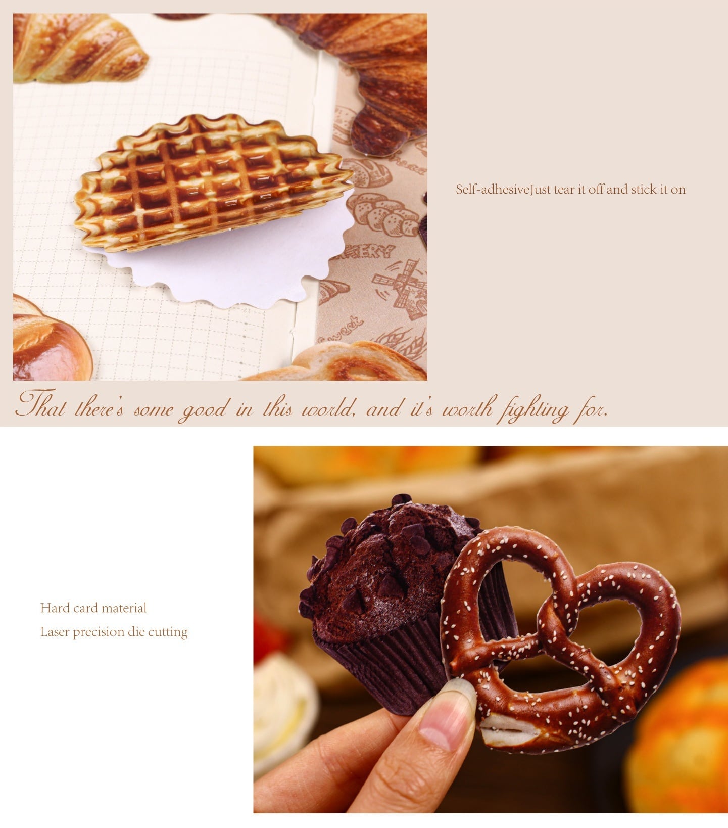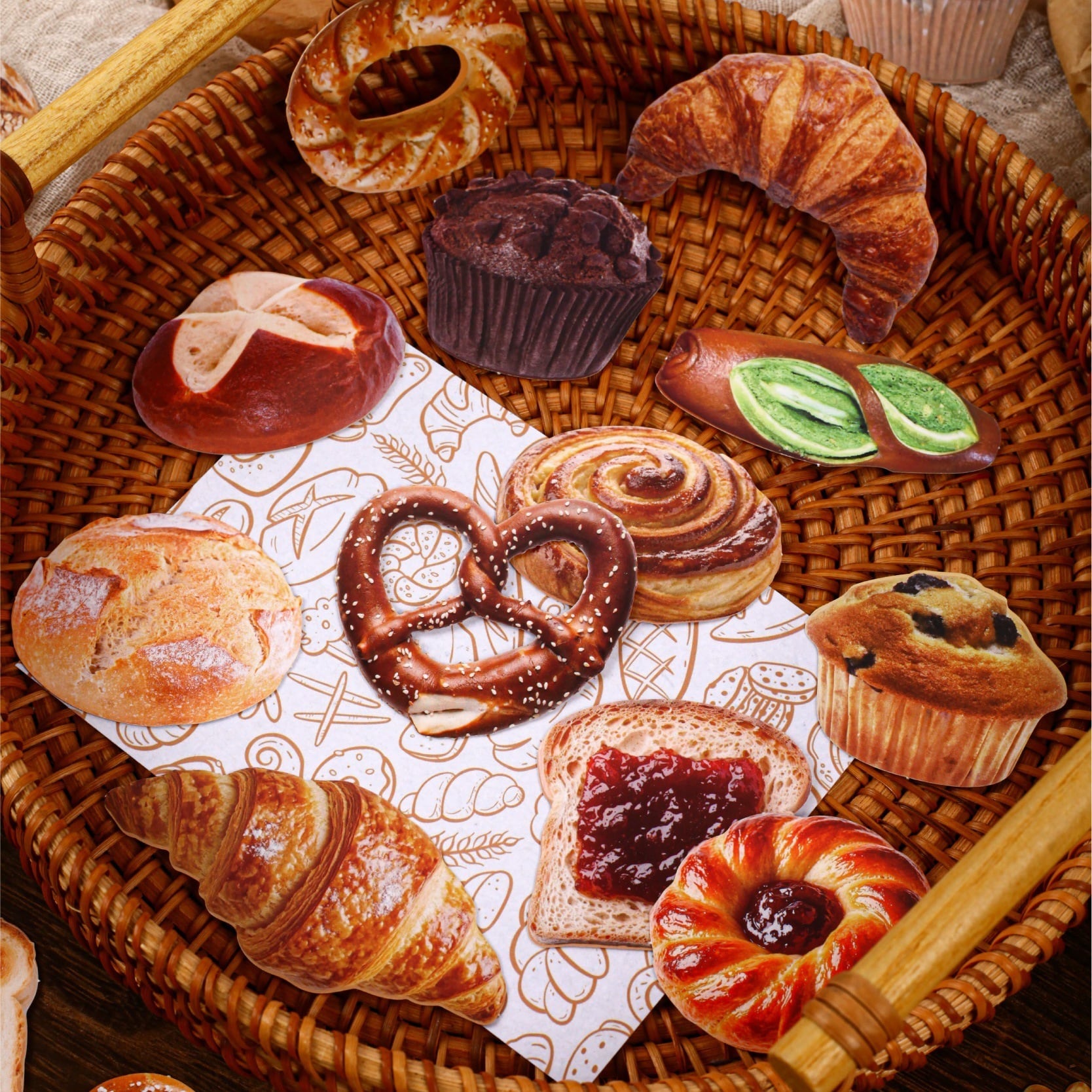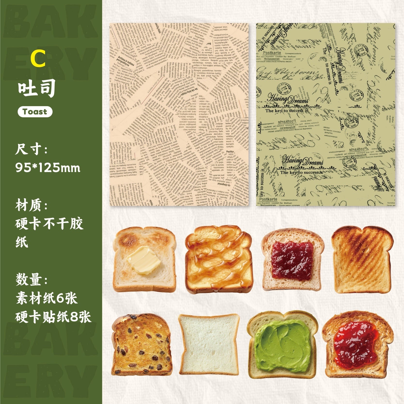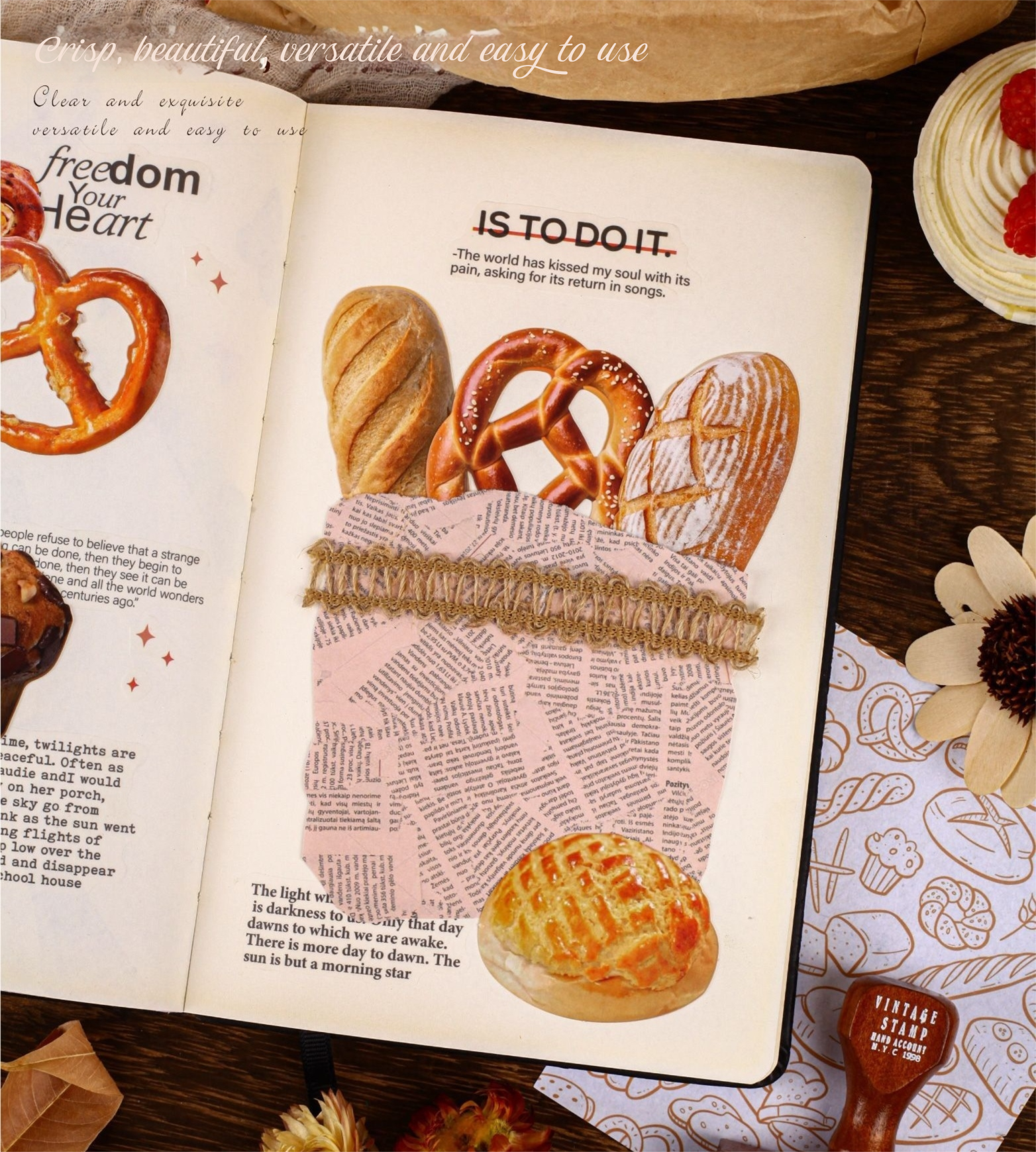 パン屋さんをテーマにしたコラージュ素材セットです。クロワッサンやプレッツェル、焼き菓子など、ベーカリーをモチーフにしたイラストを中心に、あたたかみのあるレトロな雰囲気に仕上げられています。落ち着いた色合いで、手帳デコやコラージュに取り入れやすく、ページ全体にやさしいアクセントを加えてくれます。シール部分には硬質ペーパー素材を使用しており、しっかりとした質感で貼った際の存在感もあります。素材紙と組み合わせて使うことで、ジャンクジャーナルやスクラップブッキング、ラッピング装飾など、幅広いアレンジをお楽しみいただけます。海外紙ものやベーカリー・スイーツモチーフがお好きな方におすすめの素材セットです。