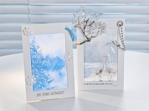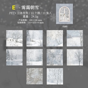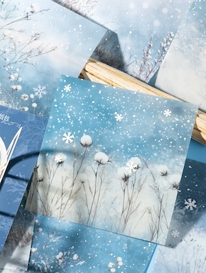 窓の外に広がる雪景色をテーマにした、冬の情景を切り取ったPETシールです。静かな森や雪の降る夜、窓越しに眺める冬の風景など、物語を感じさせるデザインが揃っています。淡いブルーを基調とした落ち着いた色合いで、コラージュや手帳デコに取り入れると、ページ全体に静けさと奥行きを添えてくれます。一部のモチーフには立体的な加工が施されており、貼るだけでさりげない存在感を楽しめるのも特徴です。PET素材のため、紙ものと重ねても重たくなりすぎず、ジャンクジャーナルやスクラップブッキング、季節感のあるデコレーションにもおすすめです。冬モチーフや幻想的な雰囲気がお好きな方に、そっと取り入れていただきたいシールセットです。