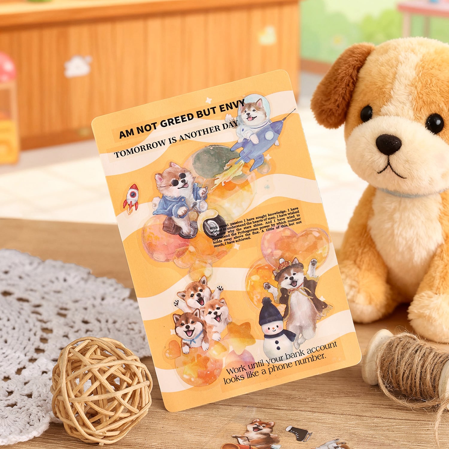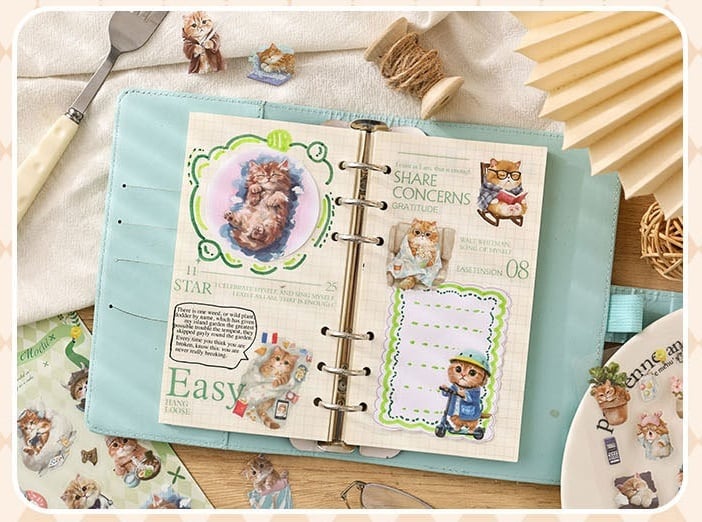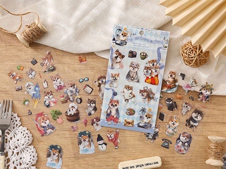愛らしい動物たちの日常を描いたPETシールです。 猫や犬を中心に、暮らしのワンシーンや小物と組み合わさったデザインが揃っており、見ているだけでも物語を感じられるセットになっています。やわらかな色合いと繊細なタッチで描かれているため、コラージュや手帳デコに取り入れると、ページ全体にやさしく温かな雰囲気を添えてくれます。PET素材のため、紙ものと重ね貼りしても重たくなりすぎず、他の素材ともバランスよく組み合わせやすいのも魅力です。手帳デコやジャンクジャーナル、スクラップブッキングなど、日常の記録や世界観づくりにそっと寄り添ってくれるシールです。 動物モチーフがお好きな方や、やさしい雰囲気のコラージュを楽しみたい方におすすめです。