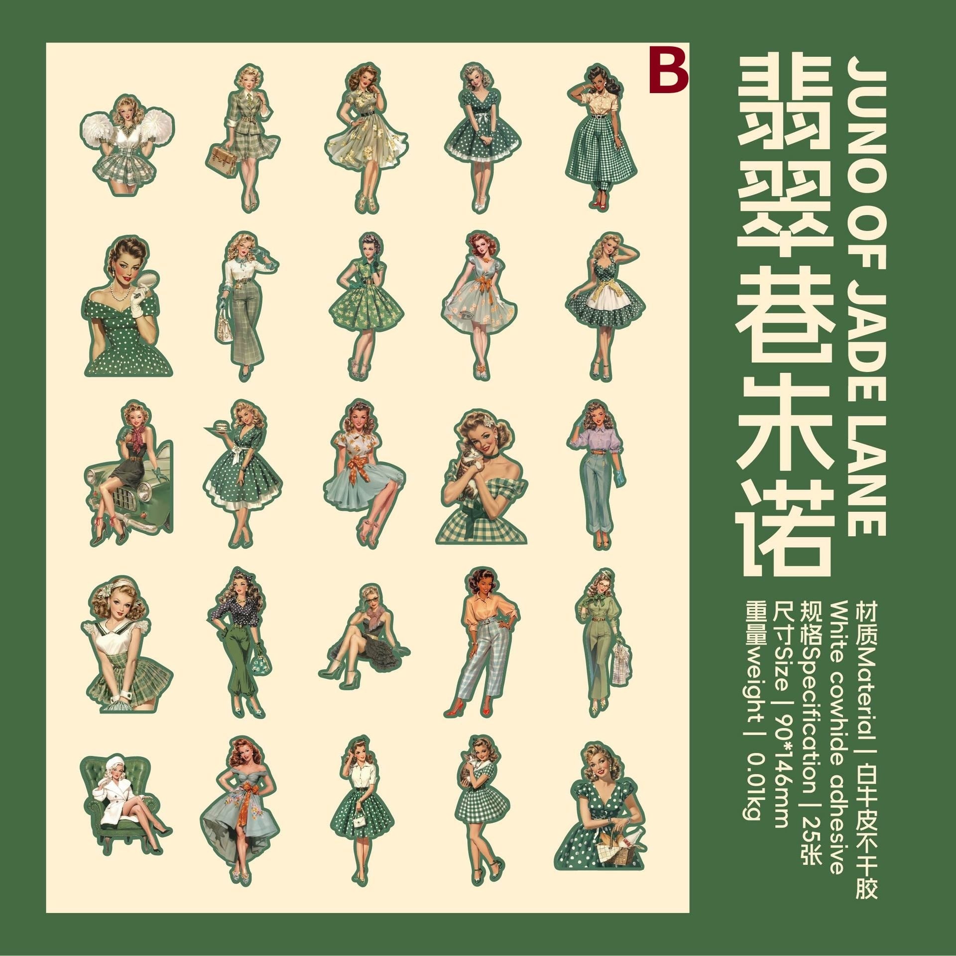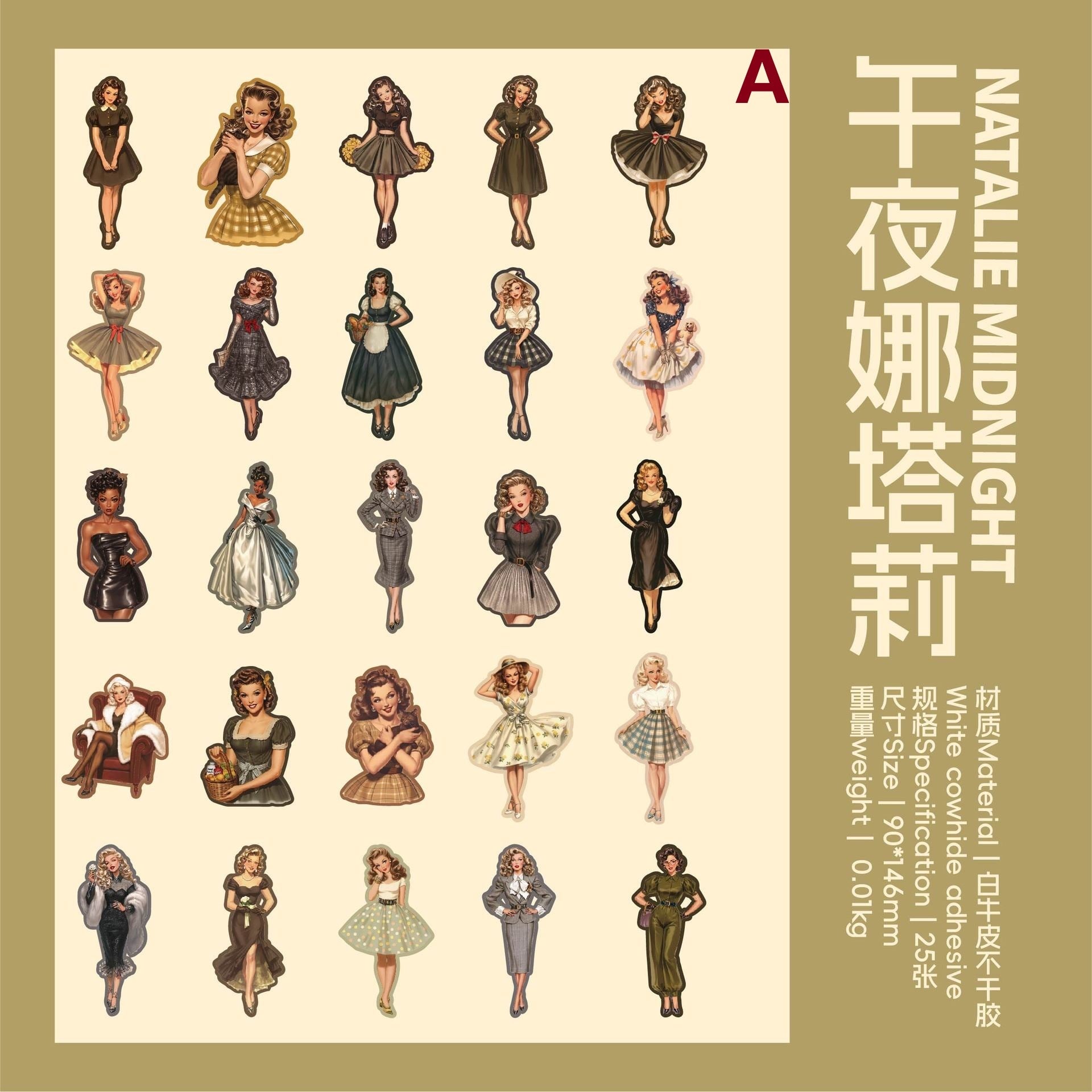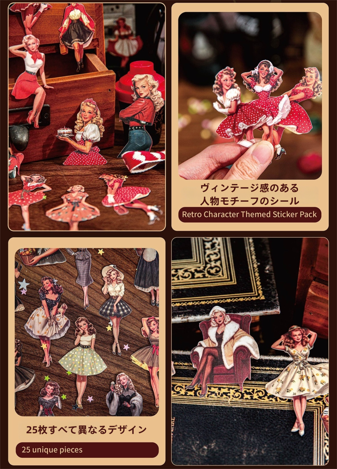 海外文具の人物モチーフをお探しの方にも取り入れやすい、クラシカルなファッションや日常のワンシーンを切り取ったような、ヴィンテージデザインのシールです。少し色あせたような色合いや、落ち着いたイラストの表情が、コラージュや手帳デコに自然と馴染み、ページ全体に物語性を添えてくれます。コラージュ素材としても使いやすく、人物モチーフでありながら主張しすぎず、他のシールや素材とも組み合わせやすいデザインです。重ね貼りや配置次第で、落ち着いた雰囲気のページづくりを楽しめます。