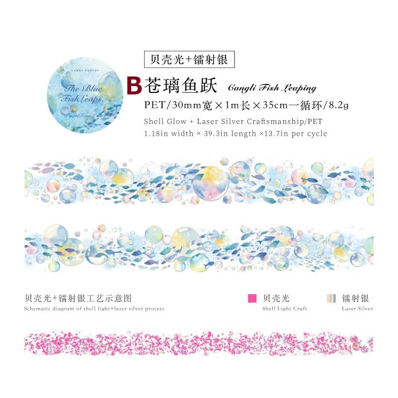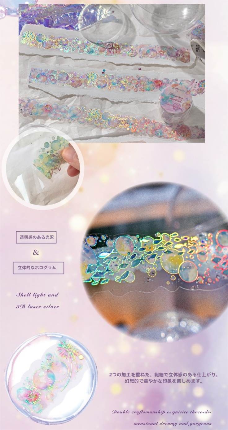 やわらかな光を閉じ込めたような幻想的な雰囲気が魅力のPETマスキングテープです。泡や光を思わせるモチーフが重なり合い、角度によって表情を変える繊細な透明感がコラージュや手帳デコに奥行きを与えてくれます。透明感のあるPET素材を使用しており、紙ものや写真の上にもすっきりと重ねてお使いいただけます。デコレーションの雰囲気を邪魔せず、さりげなくアクセントを加えたい場面にも取り入れやすい商品です。