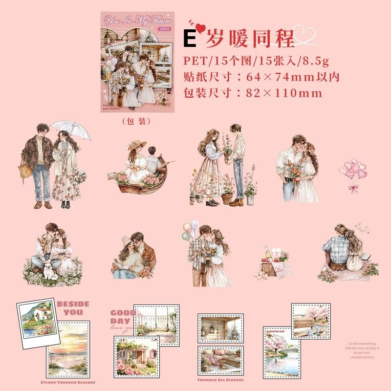 学生の何気ない日常や音楽のある時間、寄り添うカップルやウェディングを思わせる場面など、人の想いや関係性が伝わるイラストをモチーフにしたPET素材のステッカーです。やわらかな色合いと繊細なタッチで描かれたデザインは、人物イラストのシールを探している方にも取り入れやすく、手帳デコやコラージュに静かな物語性を添えてくれます。透明感のあるPETシールは重ね貼りにもなじみやすく、背景のデザインを活かしながら落ち着いた雰囲気に仕上がります。フレークタイプで使いたい絵柄を選びやすく、日記やノート、コラージュ素材としてさりげなく想いを表現したい方におすすめです。