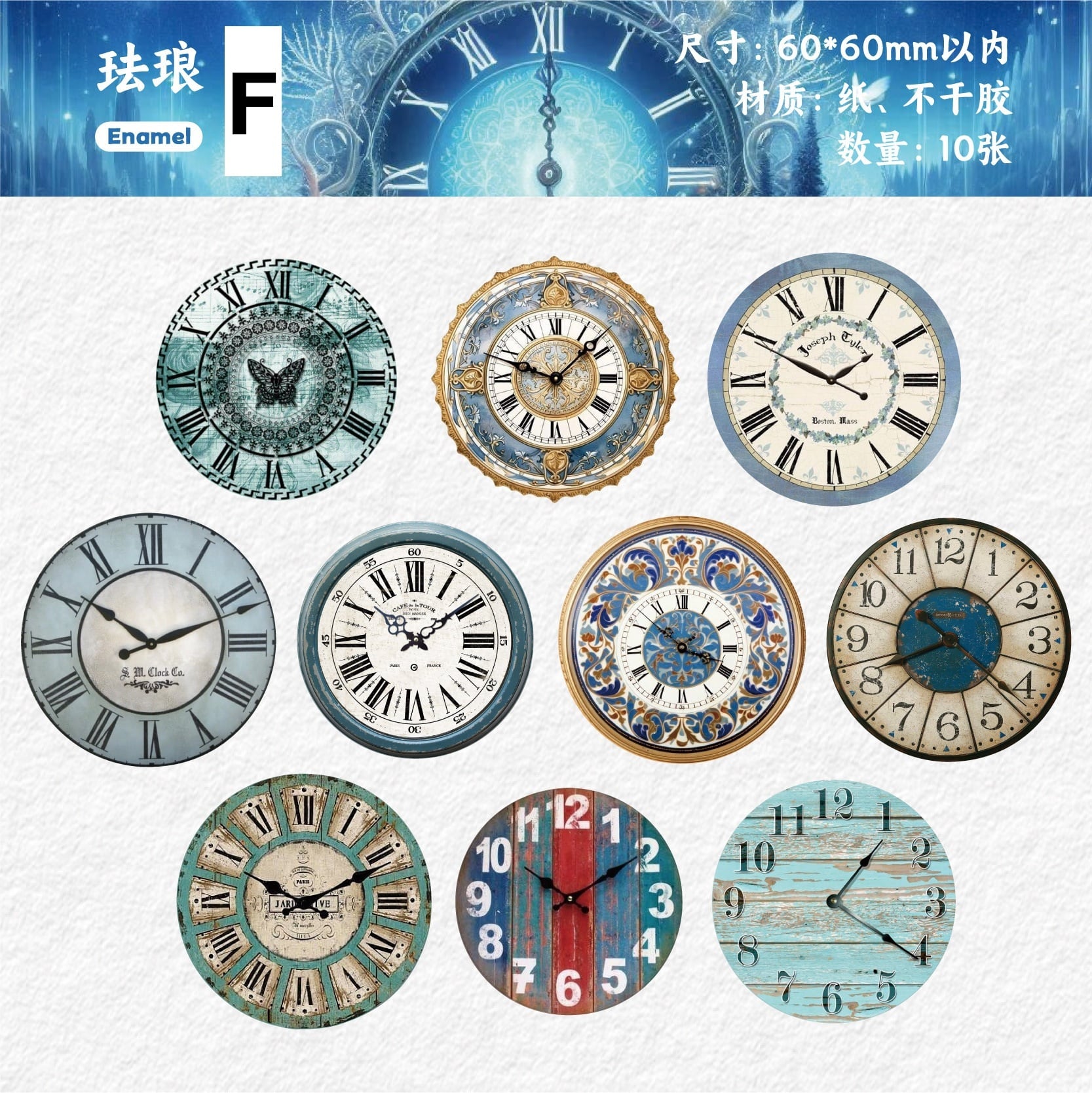 時を刻む文字盤やアンティーク調の装飾をモチーフにしたヴィンテージ感あふれるコラージュ用シールです。色褪せた木の質感や落ち着いた色合いが、古い書物や静かなカフェの記憶を思わせ、1枚貼るだけでページ全体に物語のある雰囲気を添えてくれます。1セットで世界観がまとまるようデザインされた10枚入りのため、数は多くなくても一枚一枚が主役として使いやすく、コラージュ全体を完成させやすい内容になっています。厚手でしっかりした紙素材のシールなので、薄いフィルムタイプが苦手な方やコラージュ初心者の方でも扱いやすく、ジャンクジャーナルや手帳デコ、ラッピングなど幅広いデコ素材としておすすめです。