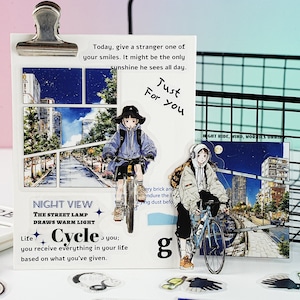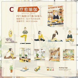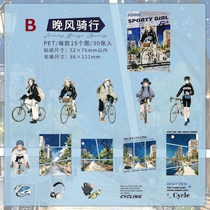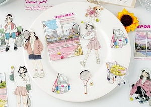 スケートボードや自転車、ヨガやテニスなど、日常の中で体を動かす女の子たちを描いたPETシールです。カジュアルで少し都会的な雰囲気のイラストは、手帳やノートに貼るだけでページ全体が軽やかな印象に仕上がります。PET素材ならではの透明感があり、写真や文字の上に重ねてもなじみやすく、コラージュやデコレーションの幅が広がります。1セットに複数デザインが入っているため、その日の気分やページの雰囲気に合わせて選ぶ楽しさも魅力です。日常記録やスクラップ、ラッピングのアクセントとしても使いやすいフレークシールです。