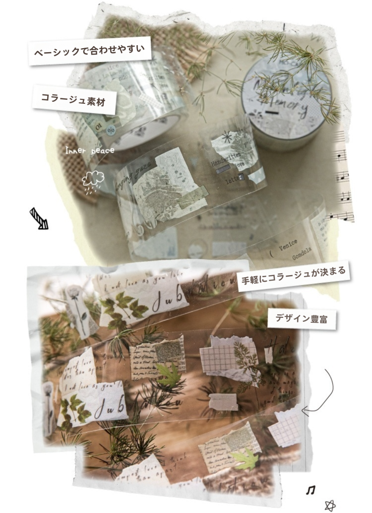 英字や紙片デザインを組み合わせたコラージュ向けのマスキングテープです。落ち着いた色合いで構成されており、手帳デコやジャンクジャーナル、日記やスクラップブックの背景づくりや余白のアクセントとして取り入れやすいデザインです。英字フレーズやメモ風レイアウトがバランスよく配置されているため、重ね貼りやレイヤーコラージュにも自然になじみます。コラージュ素材として使いやすく、英字デザインのマスキングテープをお探しの方にもおすすめの商品です。
