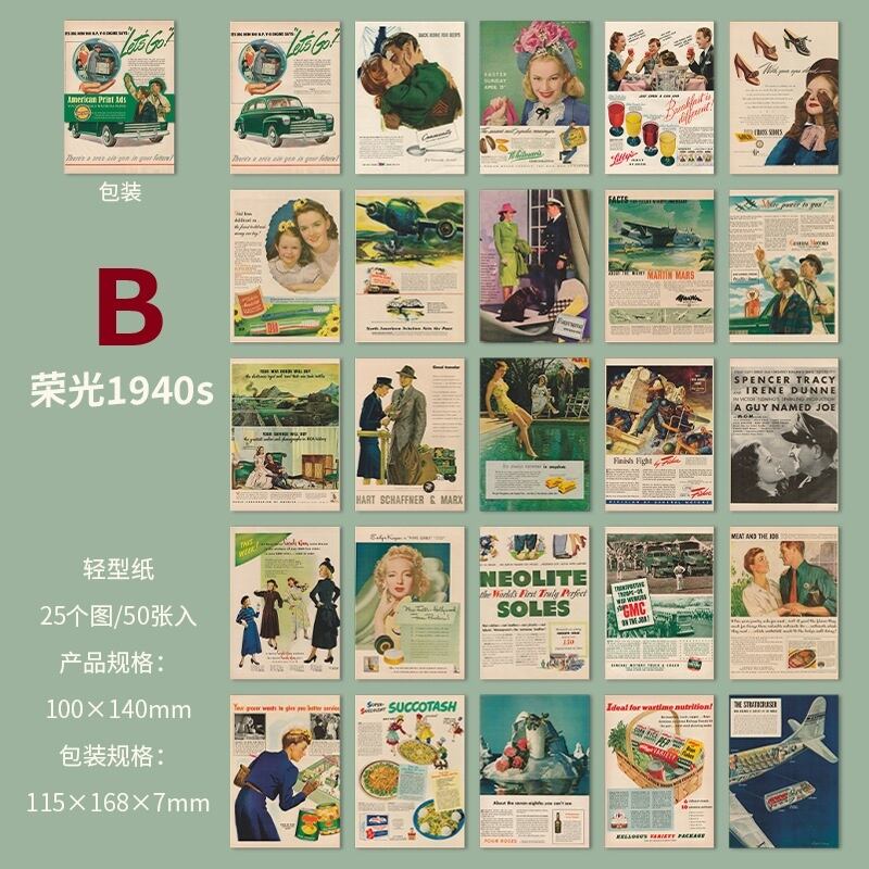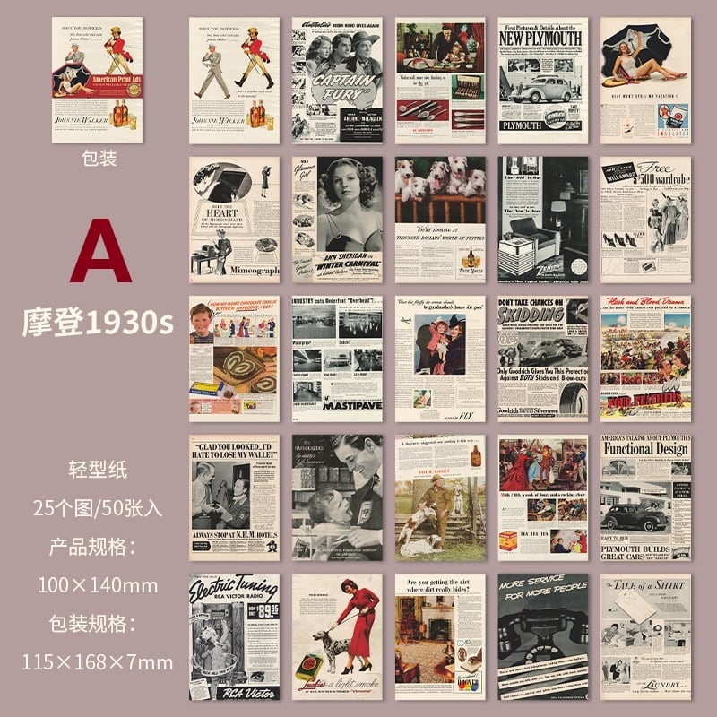 1930年代から1960年代のアメリカンヴィンテージ広告をモチーフにしたデザインペーパーです。レトロなイラストや当時の広告ならではのロゴや文字デザイン、暮らしやファッション、食品・車・家電などの広告ビジュアルをそのまま楽しめる紙もの素材で、コラージュ素材やジャンクジャーナル、手帳デコ、ラッピング、スクラップブッキングにもおすすめです。軽やかな紙質で扱いやすく、手でちぎってラフに使うこともできるため、ヴィンテージ感のあるアレンジが簡単に仕上がります。存在感のあるサイズ感で1枚使いでも映え、重ね使いすれば海外風コラージュの世界観をしっかり演出できる雰囲気たっぷりの商品です。