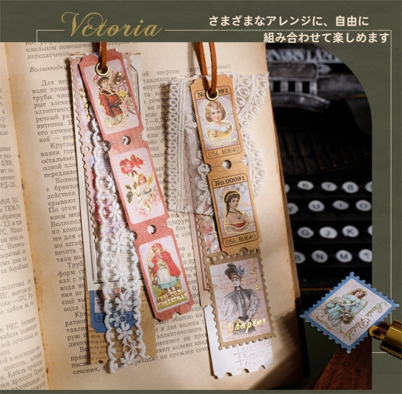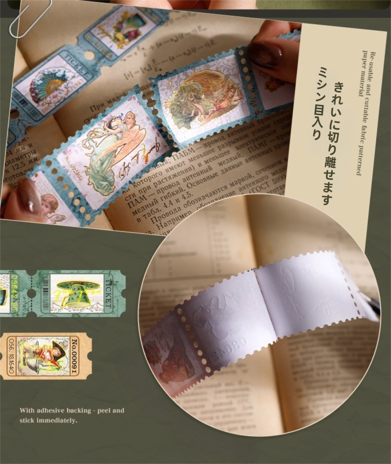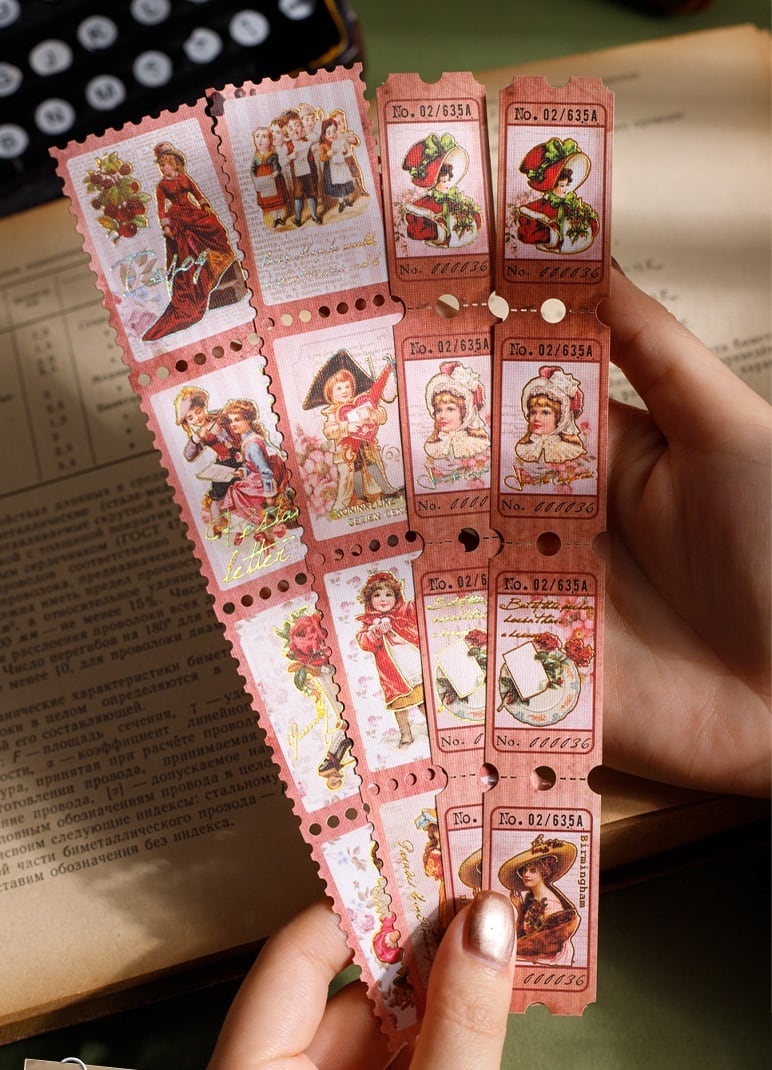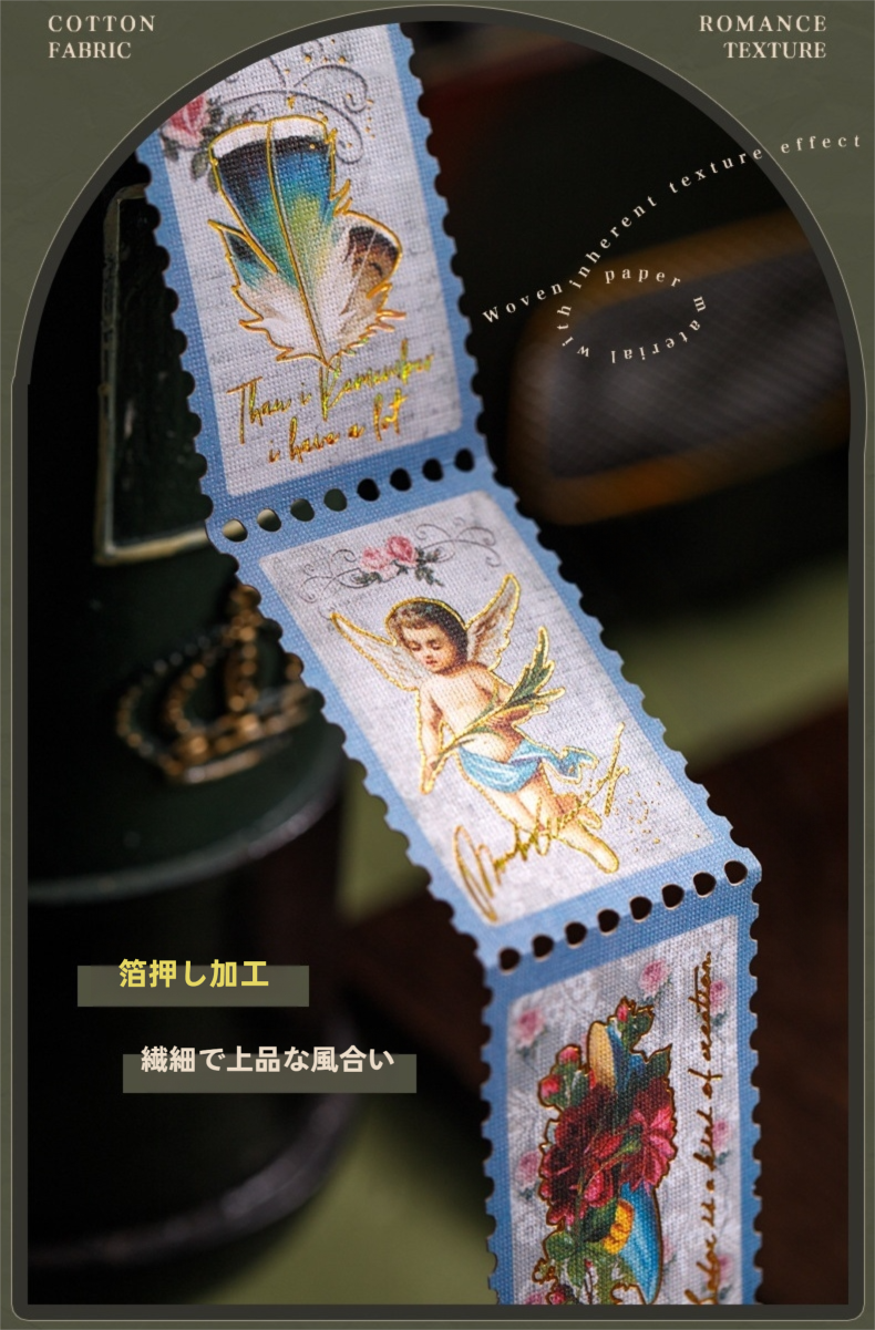 アンティークな雰囲気の切手風デザインが楽しめるシールです。凹凸のある布紋紙に繊細な箔押し加工を施し、上品な光沢と立体感が感じられます。人物や天使などクラシカルなモチーフを中心に、手帳デコやジャンクジャーナル、ヴィンテージコラージュに自然になじみます。裏面はシール加工仕様のため、はがしてそのまま貼ることができます。レトロな世界観をさりげなく取り入れられるコラージュ素材です。