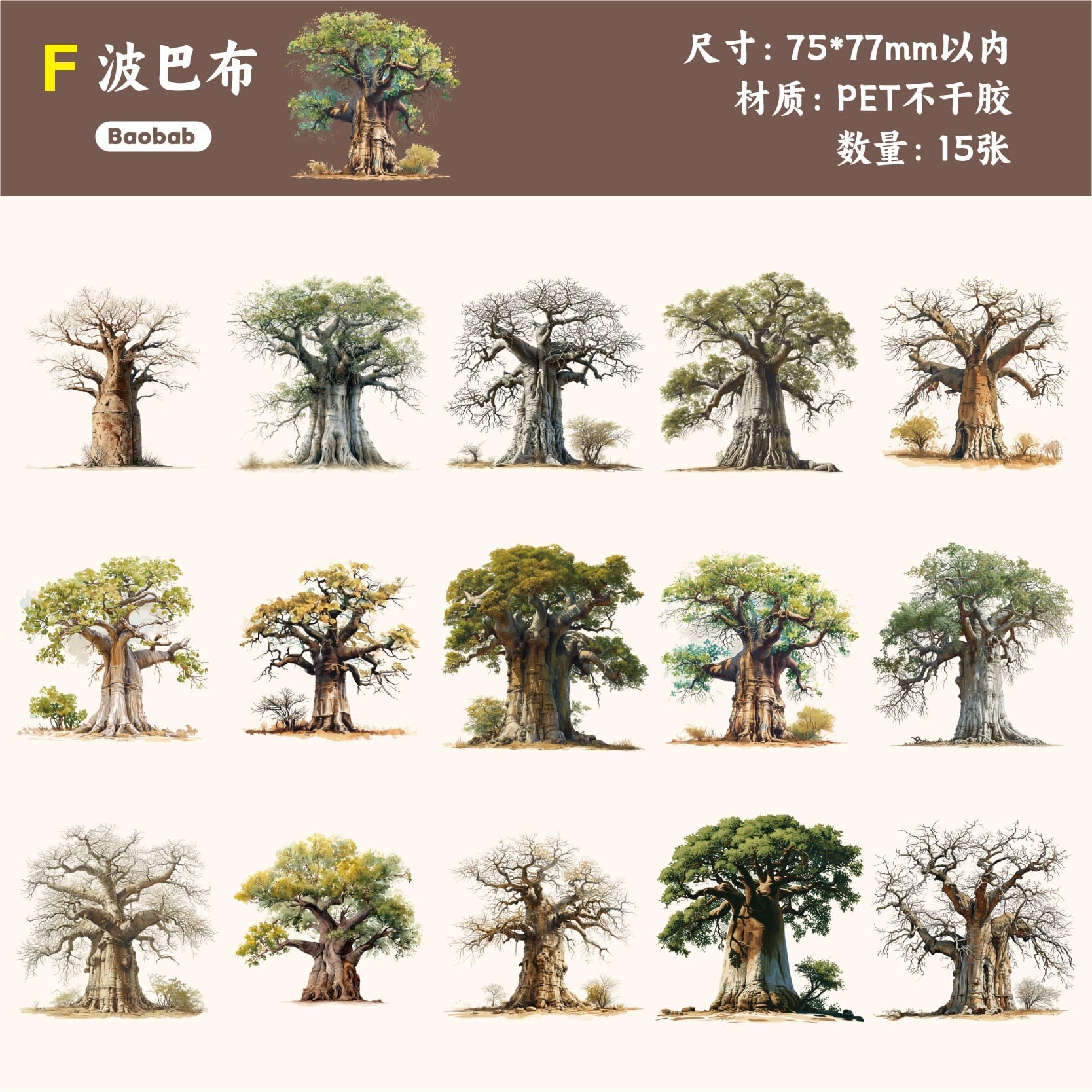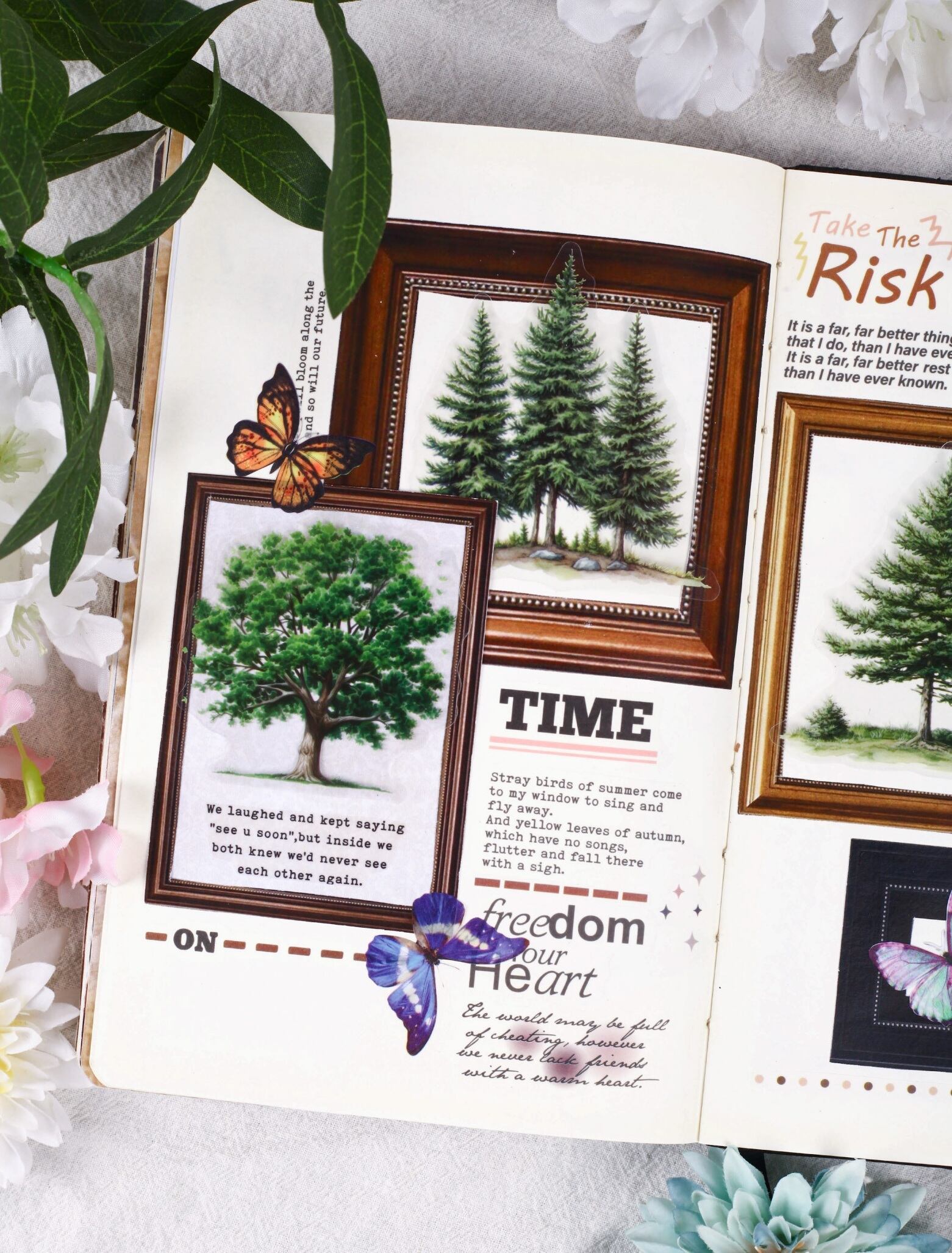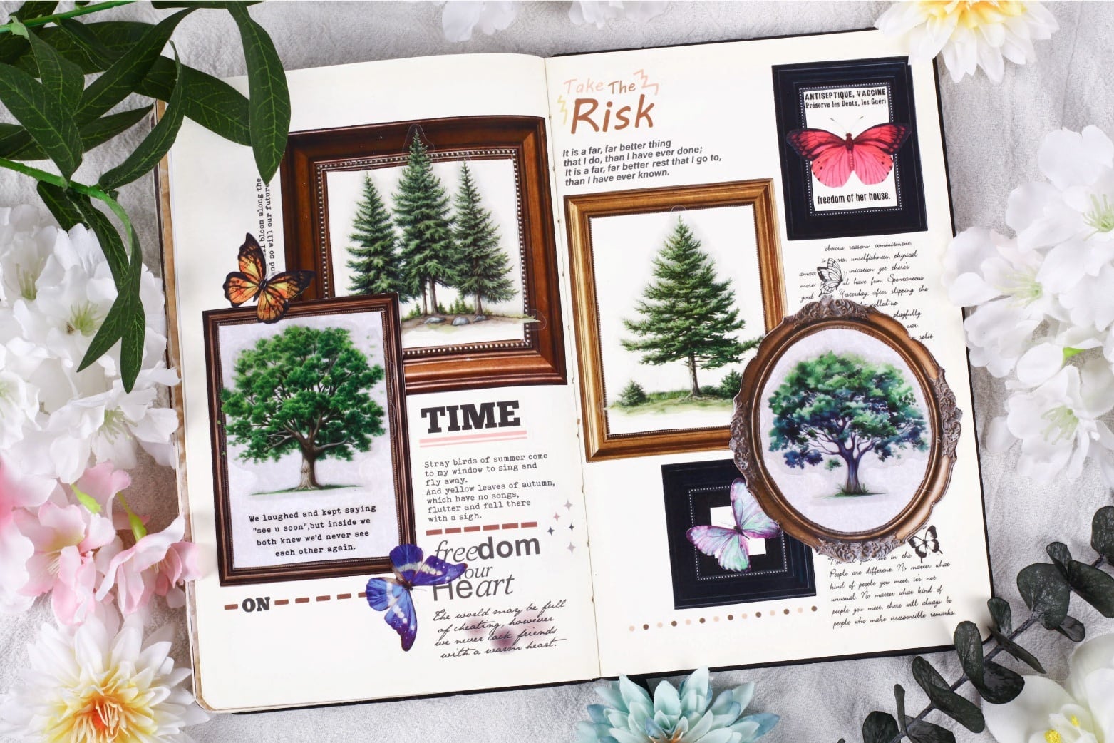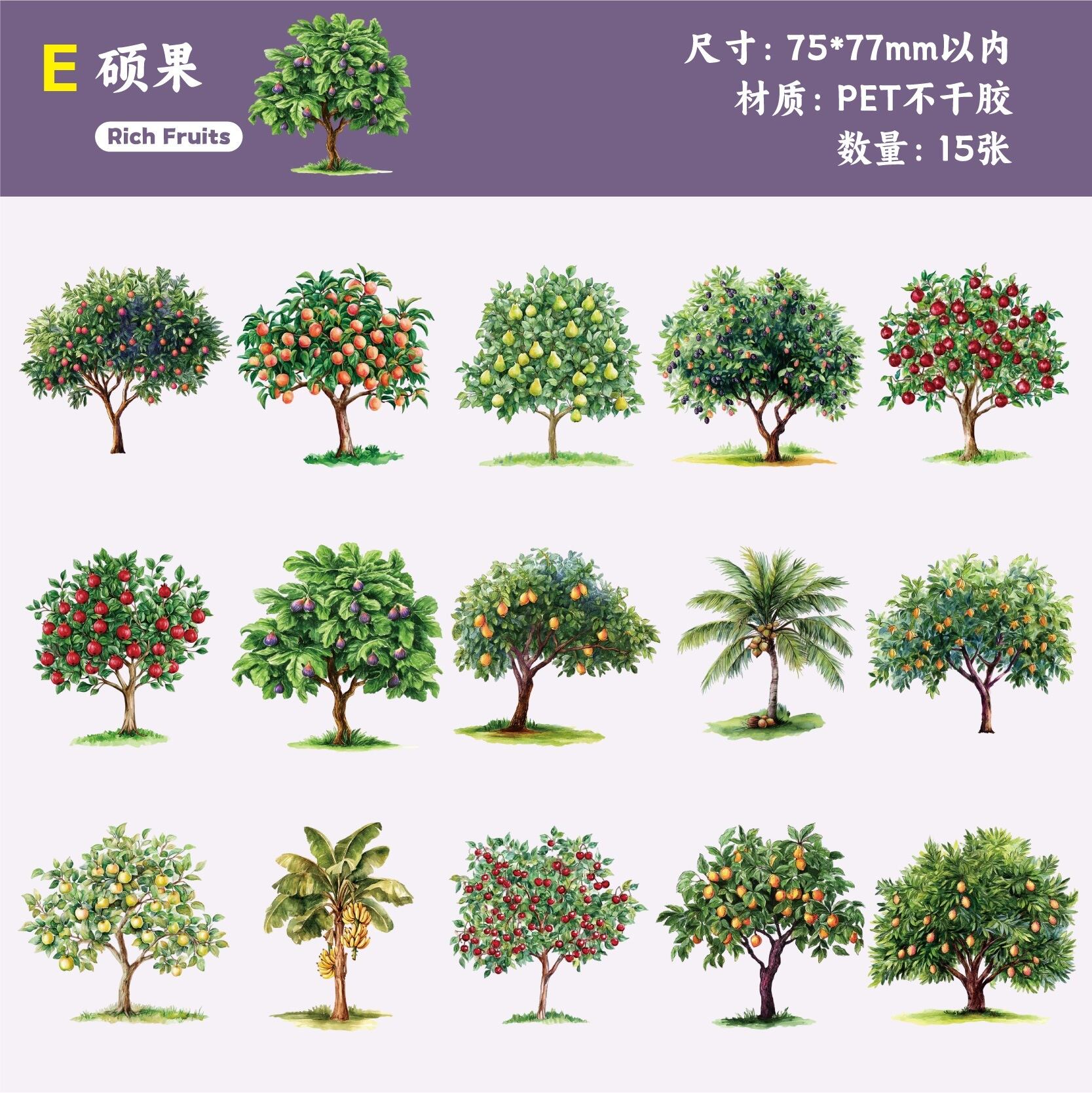 透明感のあるPET素材に繊細な木々を描いたシールです。春の桜、秋の紅葉、青々とした常緑樹や実をつけた果樹など、自然の美しさをそのまま閉じ込めたようなデザイン。手帳デコやコラージュ素材としてはもちろん、季節感を演出したいページ作りにもおすすめです。透明タイプなので背景になじみやすく、重ね貼りもしやすい仕様。植物モチーフやボタニカルデザインがお好きな方に取り入れていただきやすい商品です。