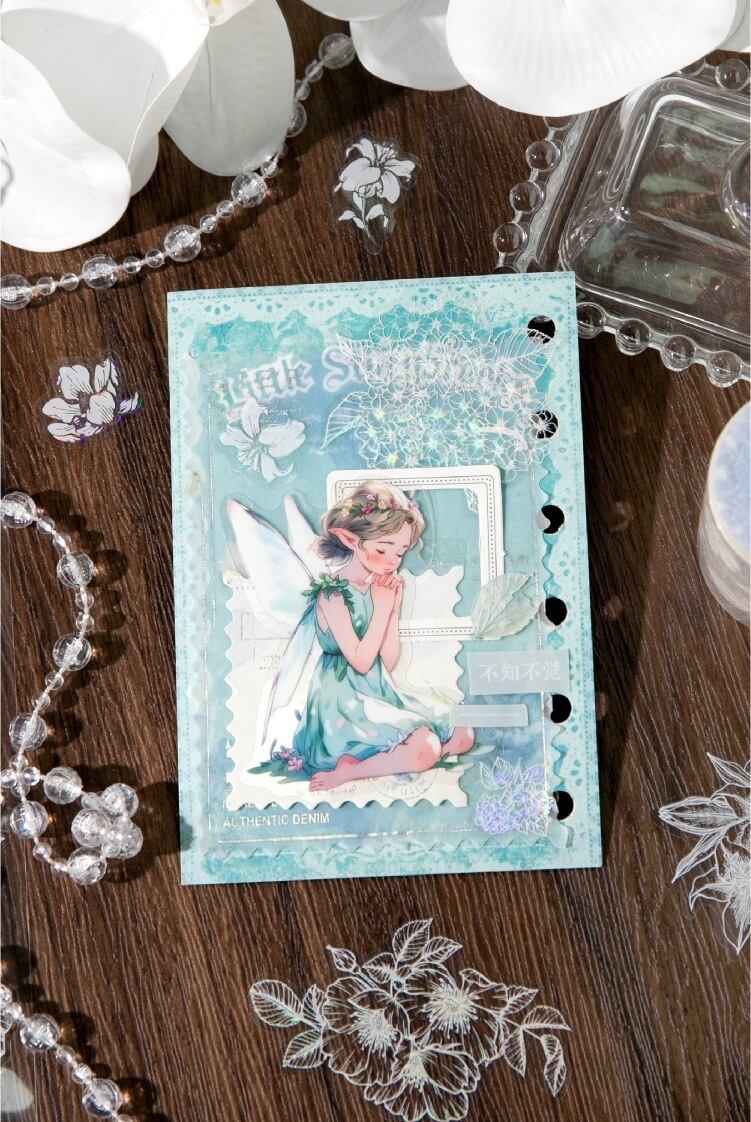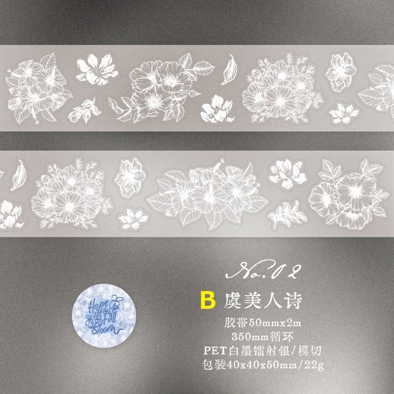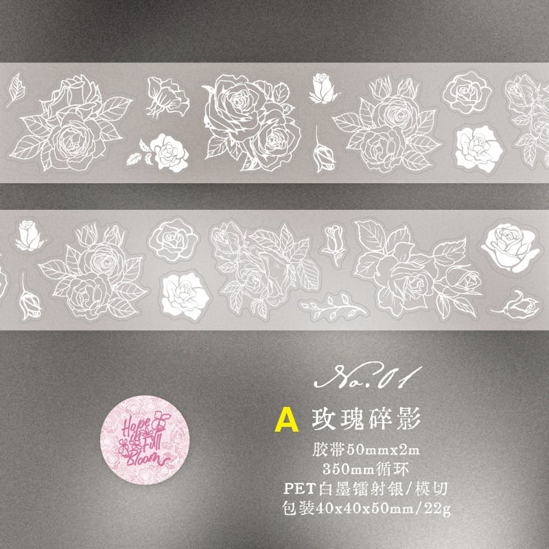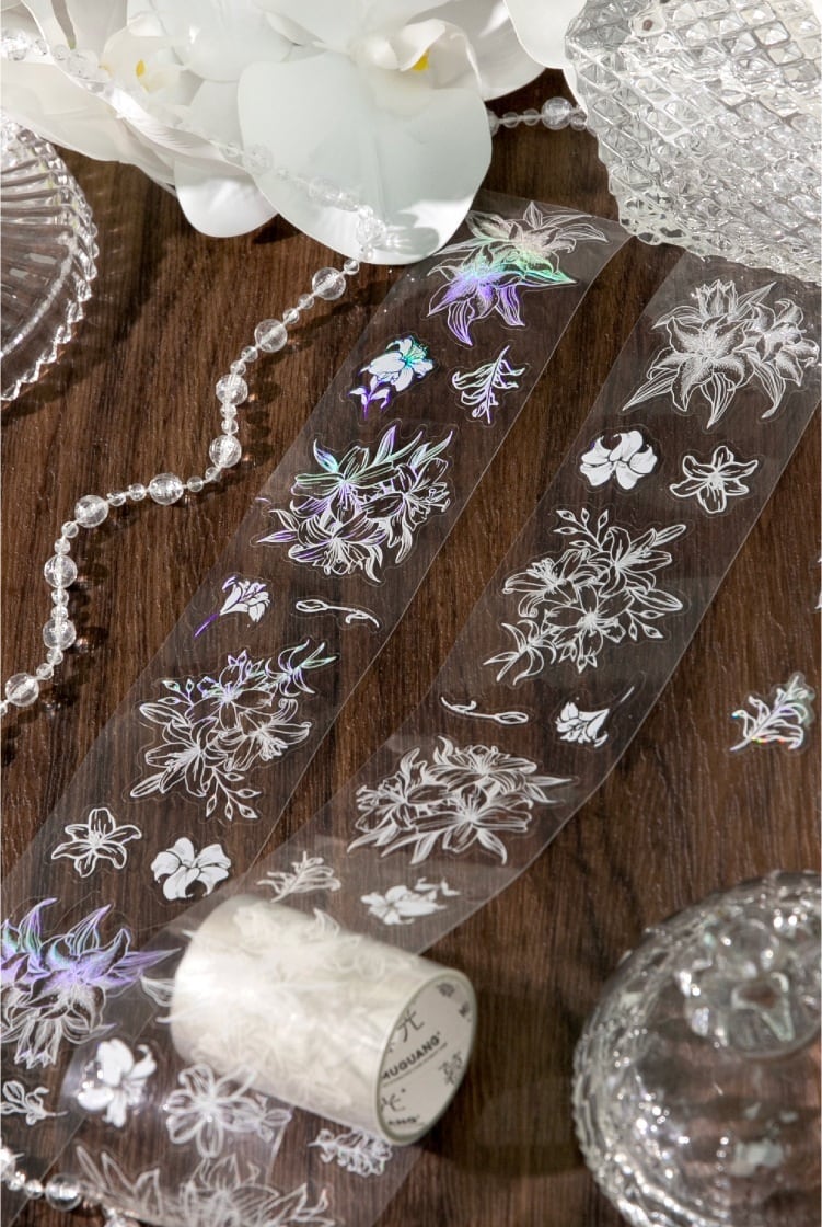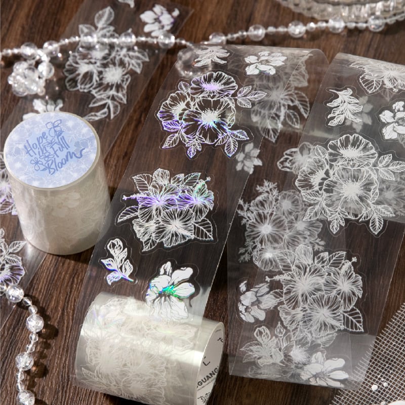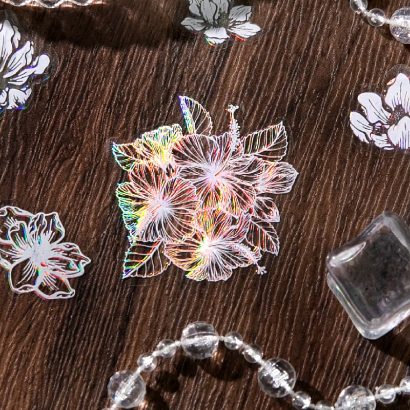 繊細な線で描かれた花のモチーフが印象的なPET素材のロールシールです。透明感のあるPETシールに白インクとホログラムの輝きが重なり、光の角度によってやさしくきらめく上品な雰囲気を楽しめます。バラや紫陽花、ユリなどさまざまなフラワーモチーフが揃っており、手帳デコやコラージュ素材としてページに軽やかなアクセントを添えてくれます。透明素材のため背景になじみやすく、素材紙や英字シール、人物シールなどと組み合わせたコラージュにも自然に溶け込みます。日記や手帳デコ、コラージュノート、スクラップなど幅広いアレンジに取り入れやすい商品です。