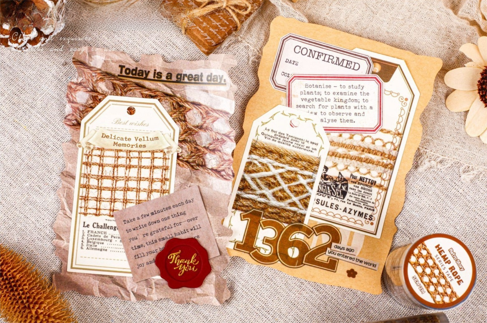 麻紐やレースのような繊細な模様が印象的な海外マスキングテープです。ナチュラルでヴィンテージ感のあるデザインは、手帳デコやコラージュ素材としてページに温かみを添えてくれます。透明感のあるPETテープなので背景になじみやすく、素材紙や英字素材、ラベルやタグと組み合わせても美しく仕上がります。手帳デコ、コラージュ、ジャンクジャーナル、スクラップブック、ラッピング装飾など幅広くお使いいただけます。コラージュ素材、手帳デコ素材、ヴィンテージ素材をお探しの方にもおすすめの商品です。