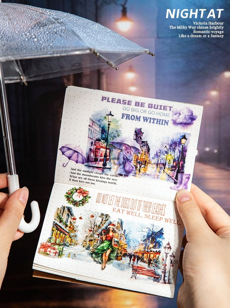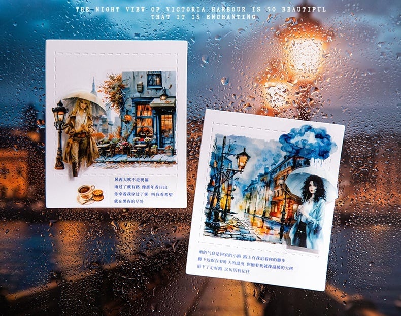 雨の夜の街並みや傘をさした人物、街灯や建物などを描いたロールシールです。透明感のあるPET素材に美しい夜景デザインが映え、コラージュや手帳デコに雰囲気のあるページを作ることができます。雨の街・ヨーロッパの街並み・クリスマス街並みなど物語のようなデザインが揃い、素材紙や英字素材、ヴィンテージ素材とも合わせやすい商品です。コラージュ素材、手帳デコ、ジャンクジャーナル、スクラップブック、海外シール、人物シール、街並みシールをお探しの方にもおすすめです。