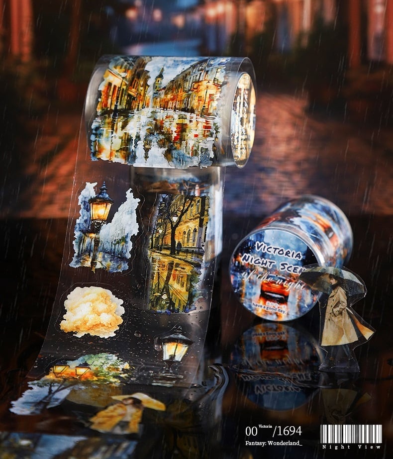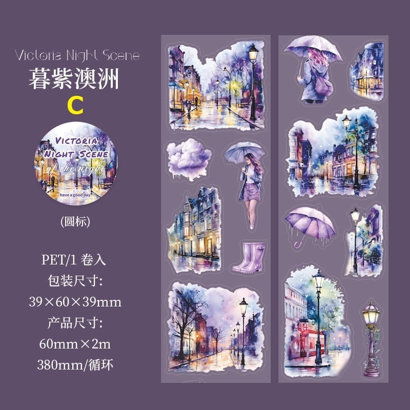 【シール】海外文具 街並み 雨の日 コラージュ素材 PETシール 手帳デコ 夜景|Victoria Night Scene