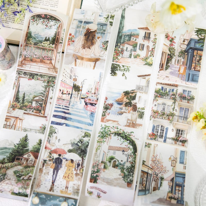 ヨーロッパの街並みや窓から見える景色、花や自然の風景などを描いた海外マスキングテープです。やさしい色合いの風景デザインがコラージュや手帳デコのページをやわらかく彩ります。窓辺の風景や街角のカフェ、雨の日の街並みなど物語のようなシーンが並び、素材紙や英字素材、人物シールとも合わせやすい商品です。コラージュ素材、手帳デコ、ジャンクジャーナル、スクラップブック、海外マステ、風景マスキングテープをお探しの方にもおすすめです。