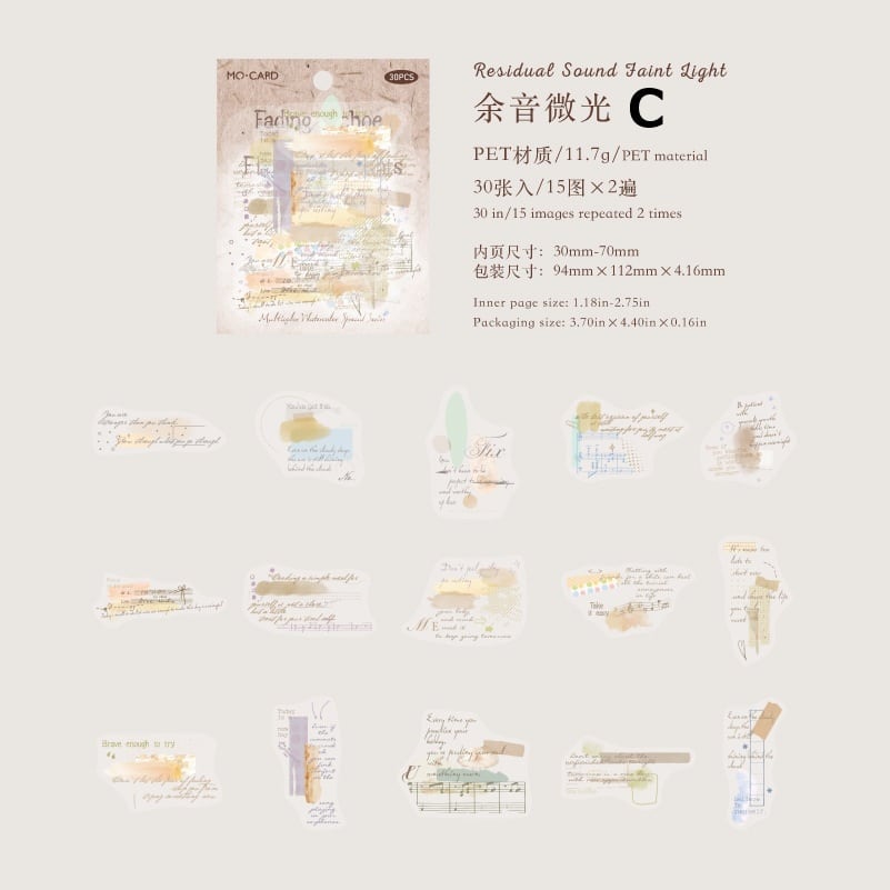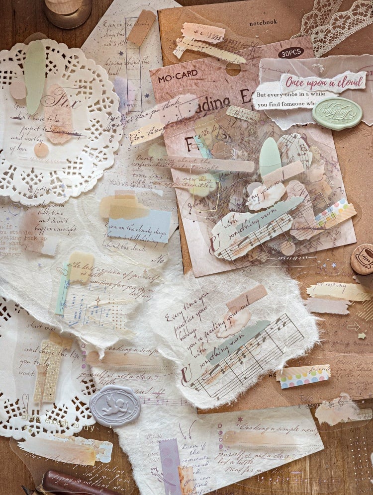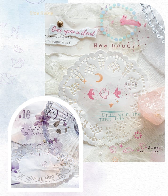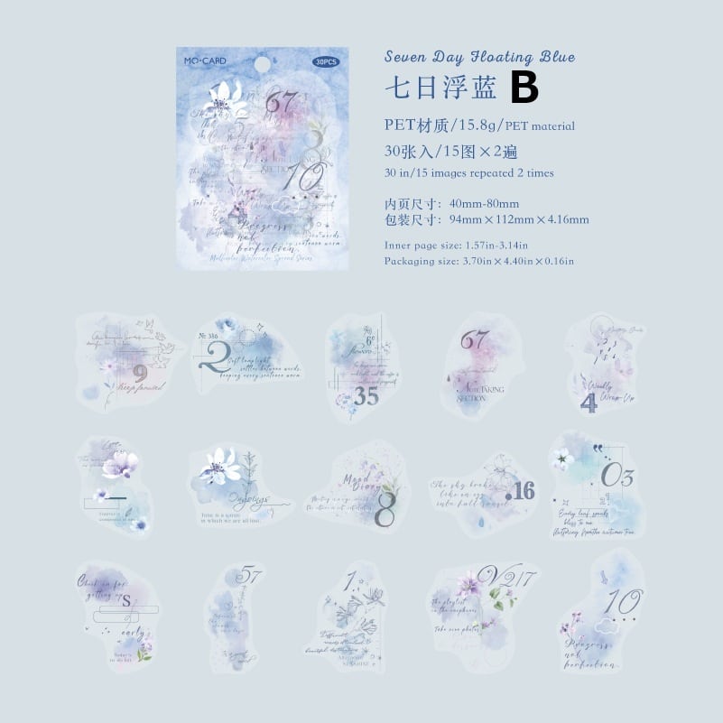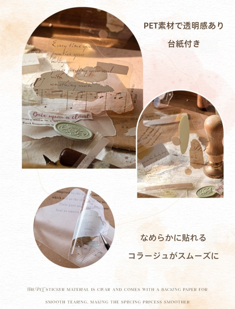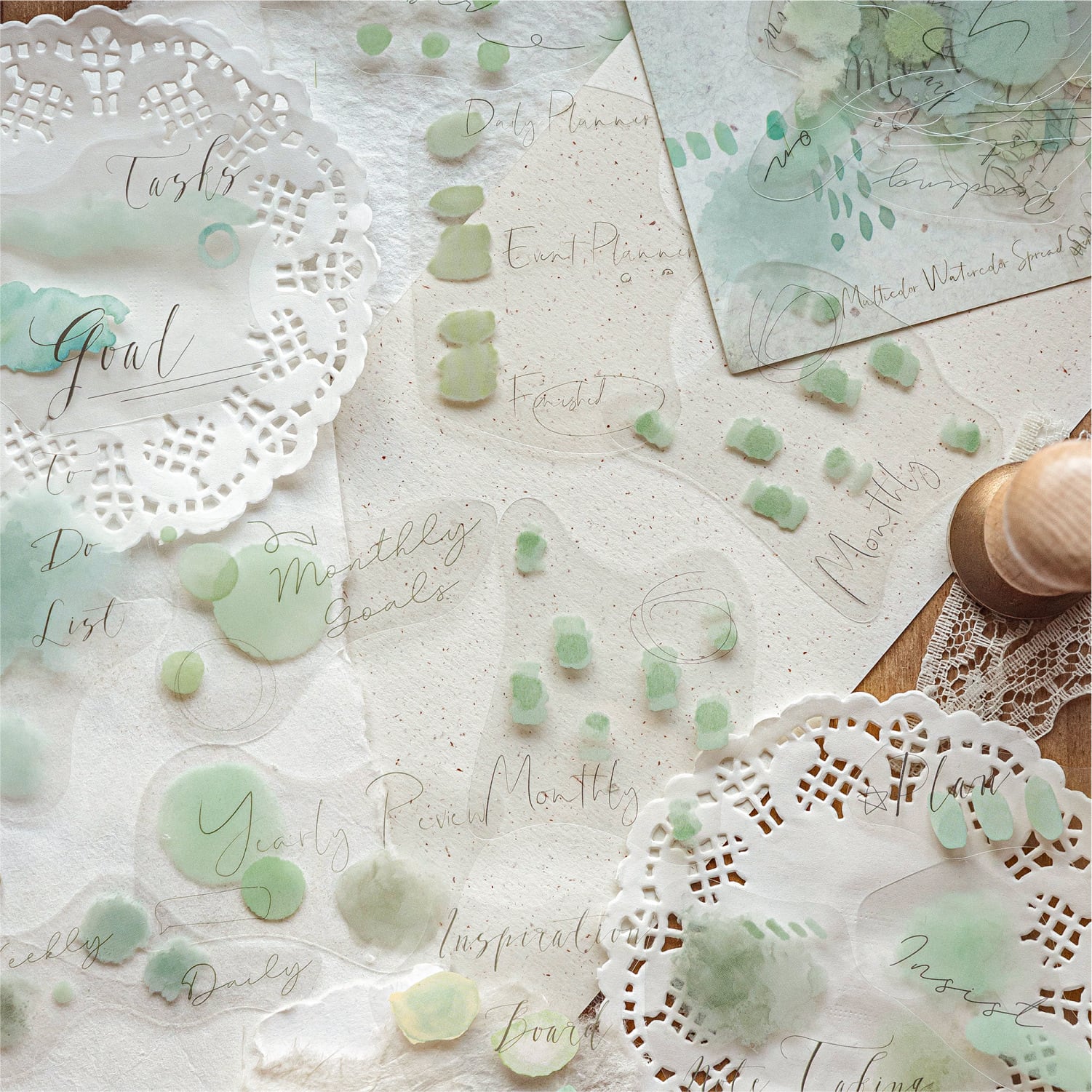 やわらかな水彩タッチで描かれた色彩が印象的なPETフレークシールです。水彩デザインならではの淡いグラデーションやインクのにじみが特徴で、貼るだけでコラージュや手帳デコに自然な奥行きと透明感をプラスできます。英字や数字デザインも含まれており、背景素材としても使いやすく、他のシールやコラージュ素材ともなじみやすい仕上がりです。透け感のあるPET素材のシールなので重ね貼りもしやすく、手帳デコ、コラージュ素材、フレークシール、透明シール、ジャンクジャーナル、ノートアレンジに幅広く活用できます。水彩デザインのシールやコラージュ素材を探している方におすすめです。