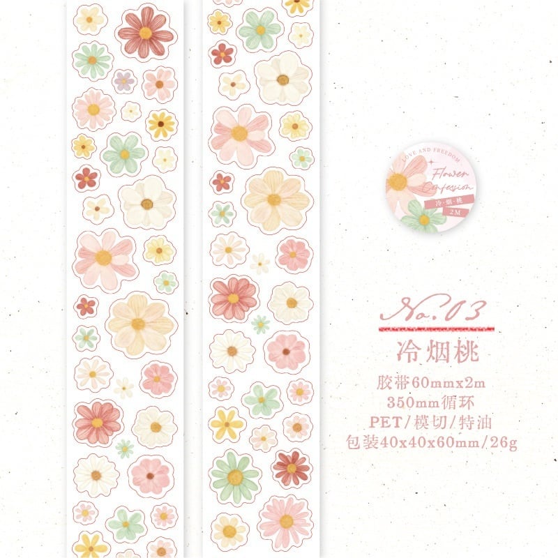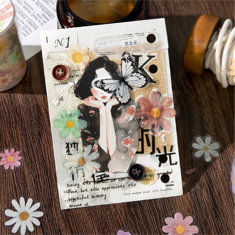やさしい色合いの花モチーフが揃った、コラージュや手帳デコに使いやすいロールシールです。淡いパステルカラーのフラワーデザインがページに自然になじみ、手帳デコ、コラージュ素材、日記デコ、ラッピング装飾など幅広くお使いいただけます。透明感のあるPET素材で、下地を活かした重ね貼りやアレンジもしやすく、繊細な印刷と白インク仕様によりやわらかな発色を楽しめます。ロールタイプで好きな長さにカットして使えるため、ワンポイントにも背景装飾にも取り入れやすいのが魅力です。花、フラワー、ロールシール、透明シール、海外シールをお探しの方におすすめのコラージュ素材です。