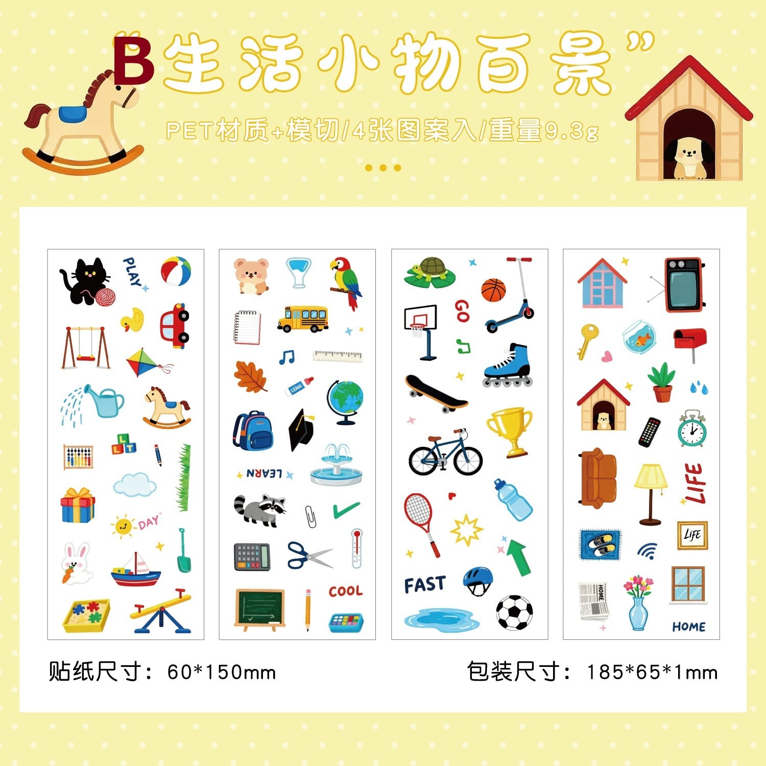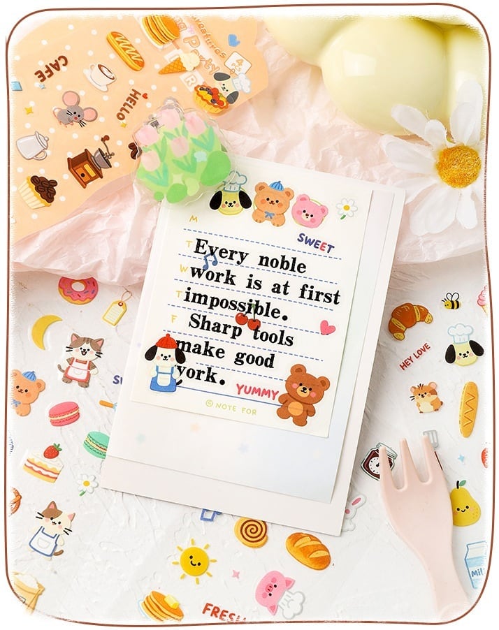 やさしい色合いと可愛らしいイラストが魅力のシートシールです。動物や日用品、食べ物など身近なモチーフが揃い、手帳デコやコラージュに取り入れやすいデザインに仕上がっています。台紙からそのまま剥がして使えるため、手軽にデコレーションを楽しめます。PET素材ならではの透け感があり、重ねて貼っても自然になじみ、初心者の方でも扱いやすい仕様です。手帳やノート、ラッピングやメッセージカードのワンポイントにも使いやすく、日常使いしやすいデザインをお探しの方にも取り入れていただきやすい商品です。