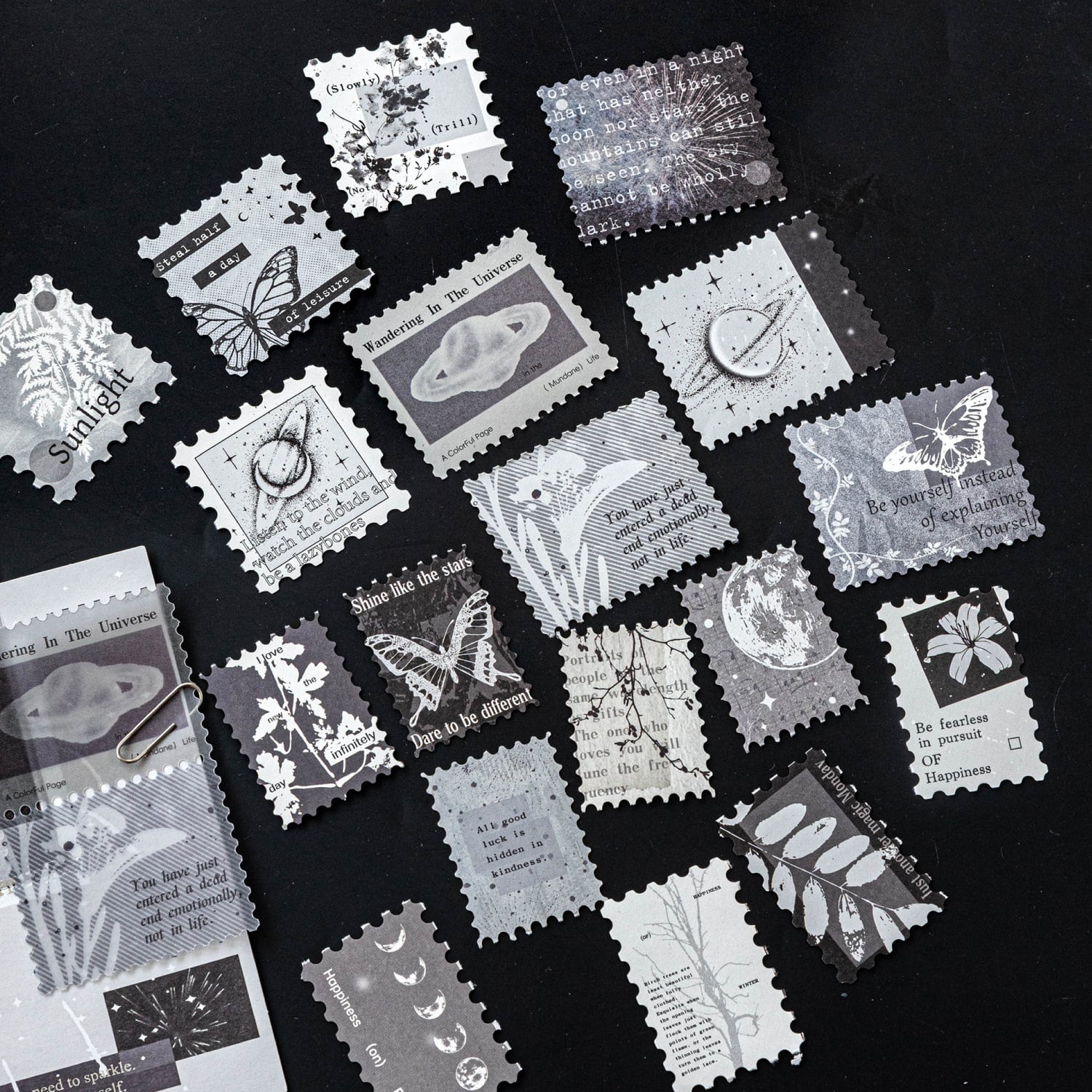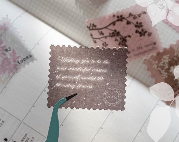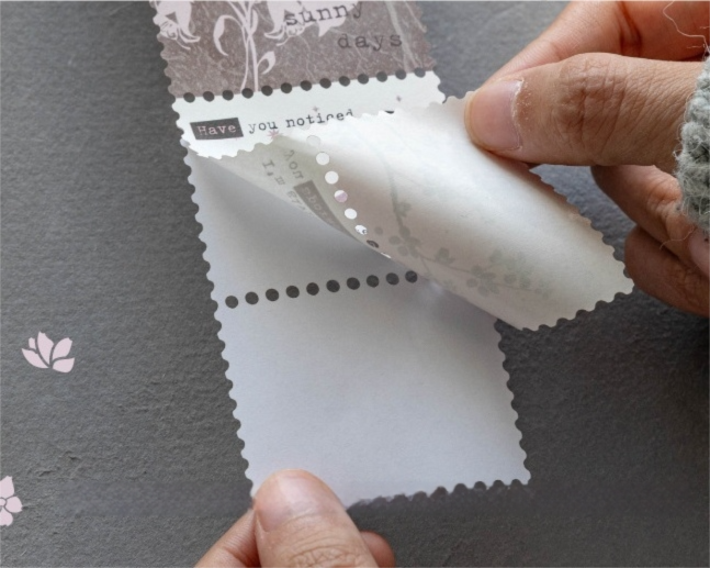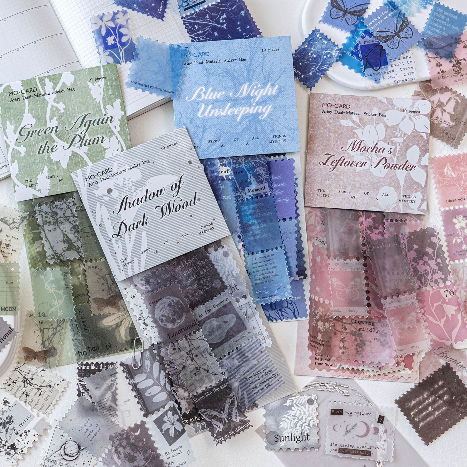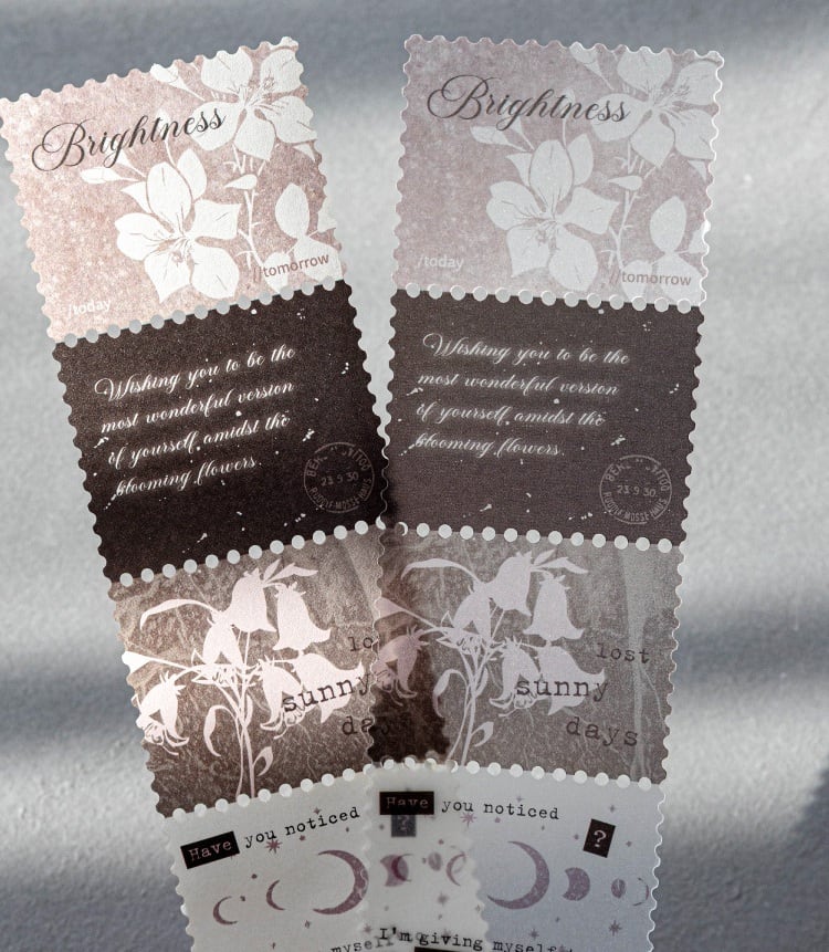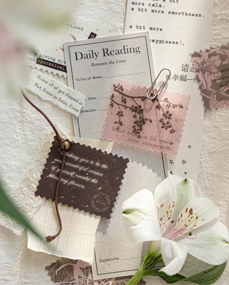 落ち着いた色合いと繊細なデザインが印象的なシールです。英字や植物モチーフを組み合わせたヴィンテージテイストで、コラージュや手帳デコに自然になじみます。白牛皮紙と硫酸紙の異なる紙素材を組み合わせており、ナチュラルな質感とほんのり透け感のある表現を楽しめる仕様です。切り取り線が入っているため、手でちぎるだけで簡単に使え、ラフな風合いを活かしたアレンジにも取り入れやすいです。重ねて貼ることで奥行きのある仕上がりになり、背景づくりやアクセントとしても使いやすく、コラージュ素材や手帳デコ素材、ヴィンテージシールを取り入れたい方にもおすすめです。