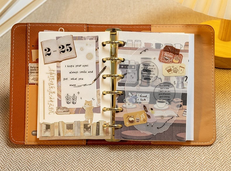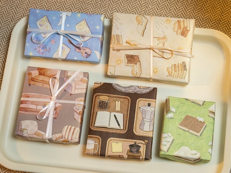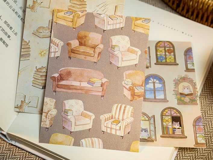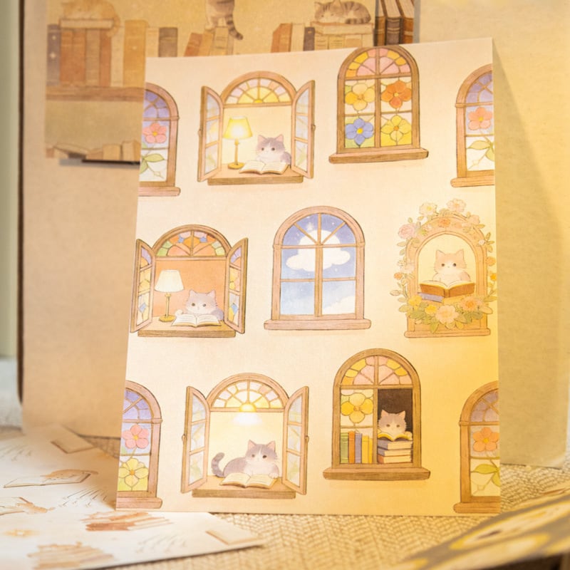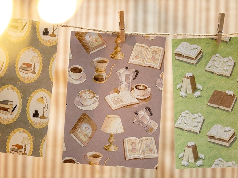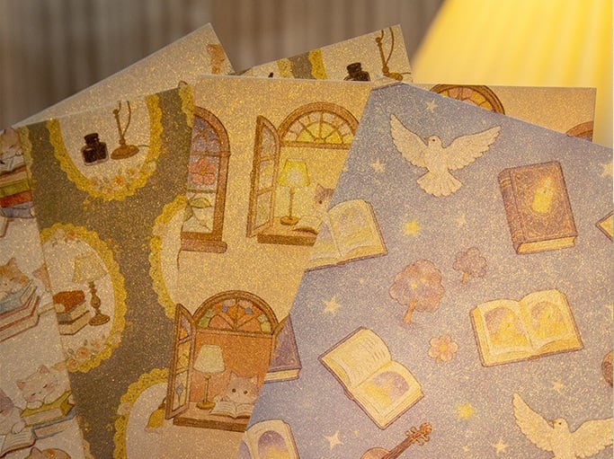 本や星、やさしい夜の世界観を詰め込んだ素材紙です。コラージュ素材や手帳デコ、日記デコに取り入れやすい落ち着いたデザインで、貼る・切る・重ねるだけで自然に雰囲気のあるページに仕上がります。パールのような質感の紙素材を使用しており、光の角度によってほんのりと輝く上品な風合いが特徴です。猫や本棚、カフェのモチーフなど日常に寄り添うイラストが揃っており、コラージュ初心者の方でも扱いやすいのも魅力です。手帳やノートのデコレーションはもちろん、ラッピングやカード作り、背景素材としても幅広くお使いいただける商品です。