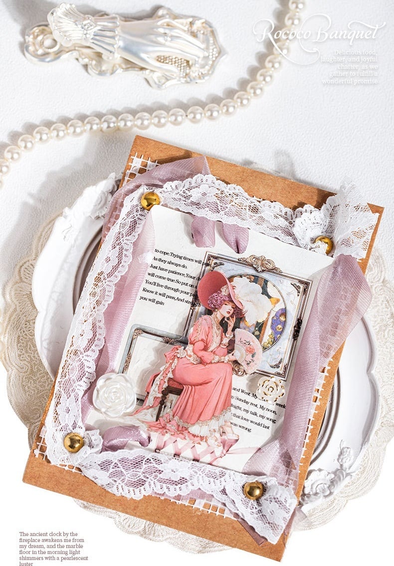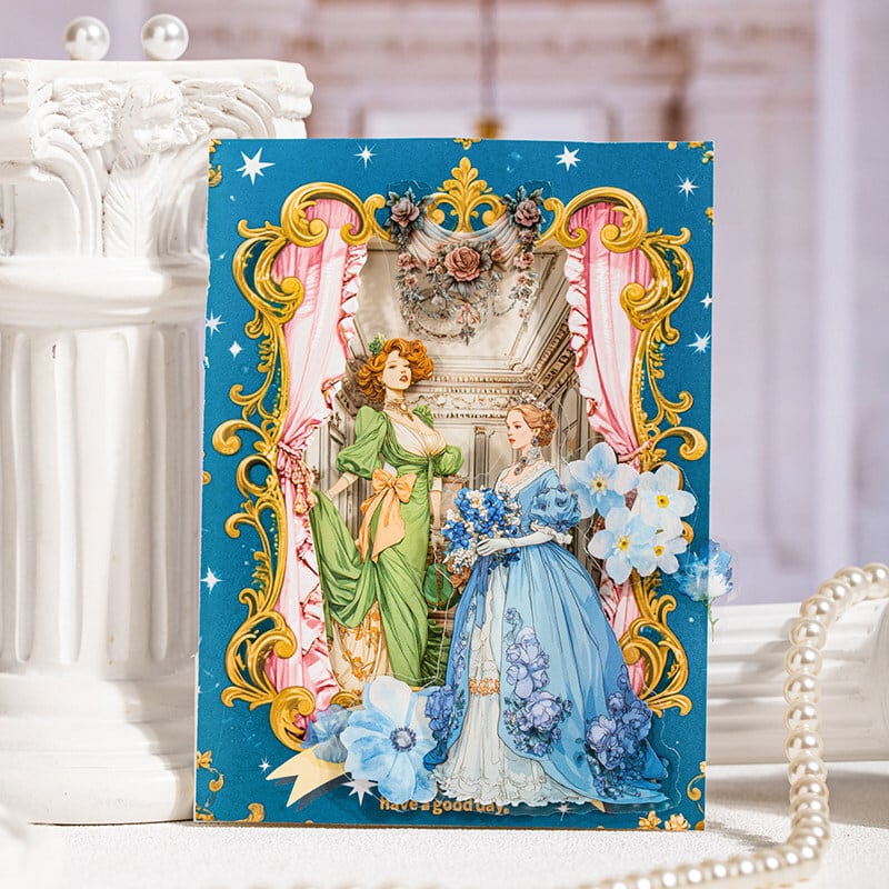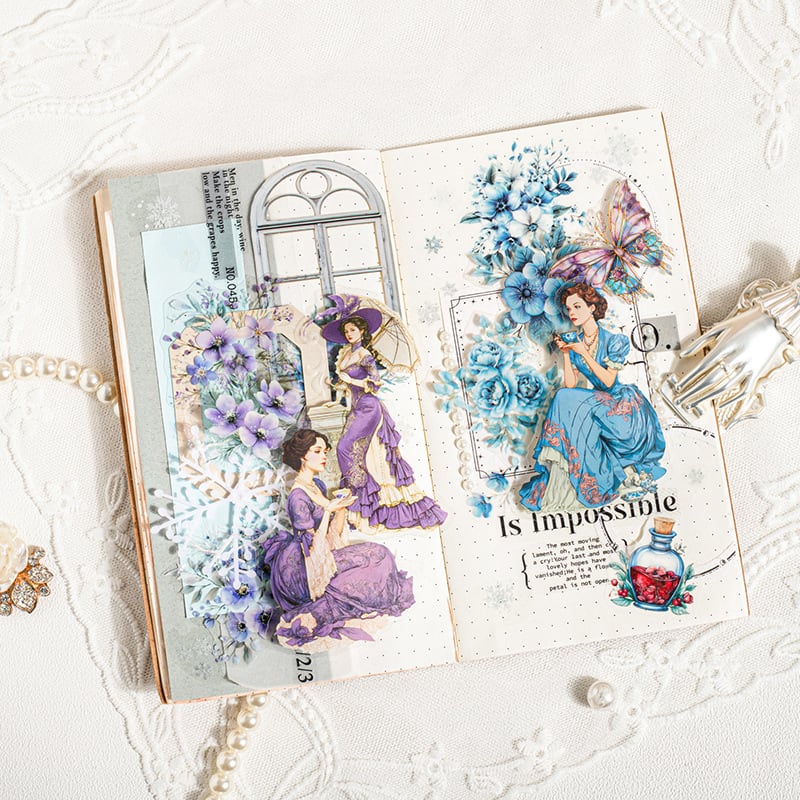 ロココ調のドレスをまとった人物が美しく描かれたコラージュ素材シールです。華やかな衣装や優雅なポーズが印象的で、手帳デコやコラージュに上品でクラシカルな雰囲気を添えてくれます。PET素材ならではのほどよい透明感とツヤ感があり、重ね貼りや背景との組み合わせも自然に仕上がるのが特徴です。貴婦人モチーフやドレスシールがお好きな方にも取り入れやすく、コラージュのアクセントとして幅広くお使いいただけます。海外文具、コラージュ素材、シール、手帳デコ、人物シール、ヴィンテージ、ロココ調、PETシールがお好きな方におすすめです。