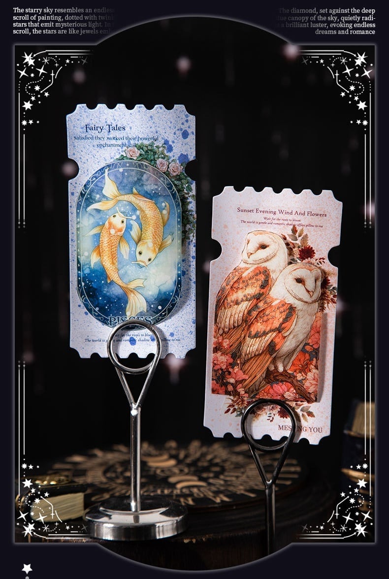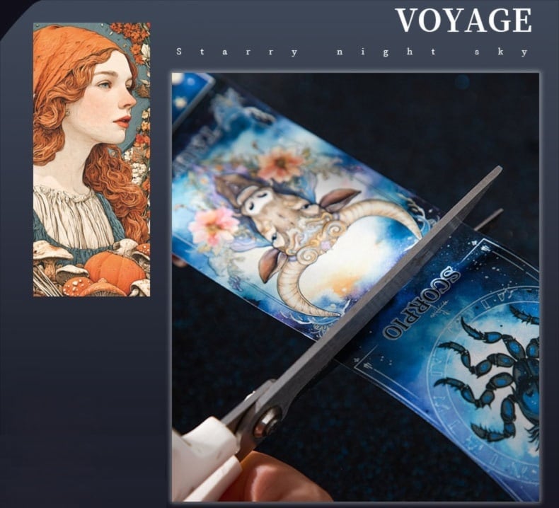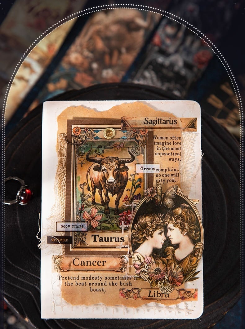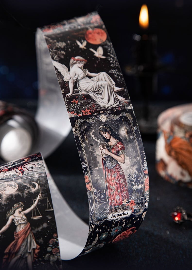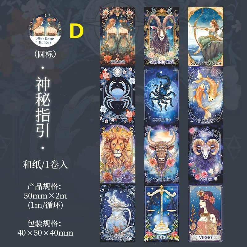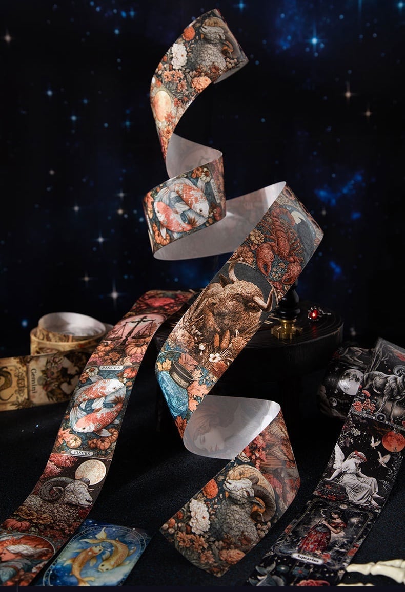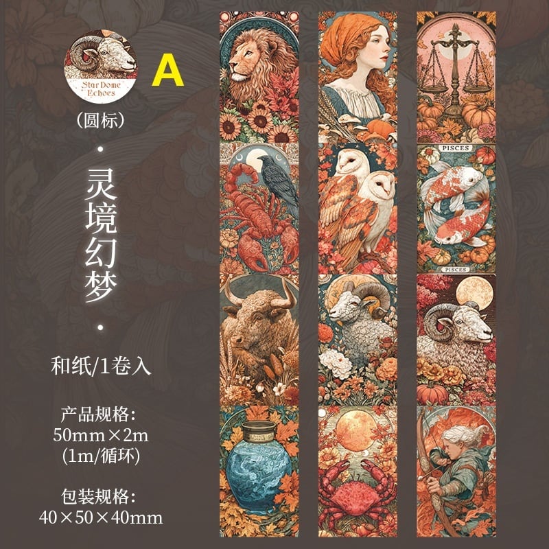 星座や神秘的なモチーフが美しく描かれたコラージュ素材のマスキングテープです。獅子や蠍などの星座モチーフや幻想的な人物・動物が組み合わされ、手帳デコやコラージュに奥行きのある世界観を添えてくれます。和紙素材ならではのやわらかな質感で、貼り重ねやすく自然になじむ仕上がりです。幅広タイプのため一枚でしっかりと存在感があり、カットして使うことでアレンジの幅も広がります。海外文具、コラージュ素材、マスキングテープ、手帳デコ、星座モチーフ、幻想系、和紙マステがお好きな方におすすめです。