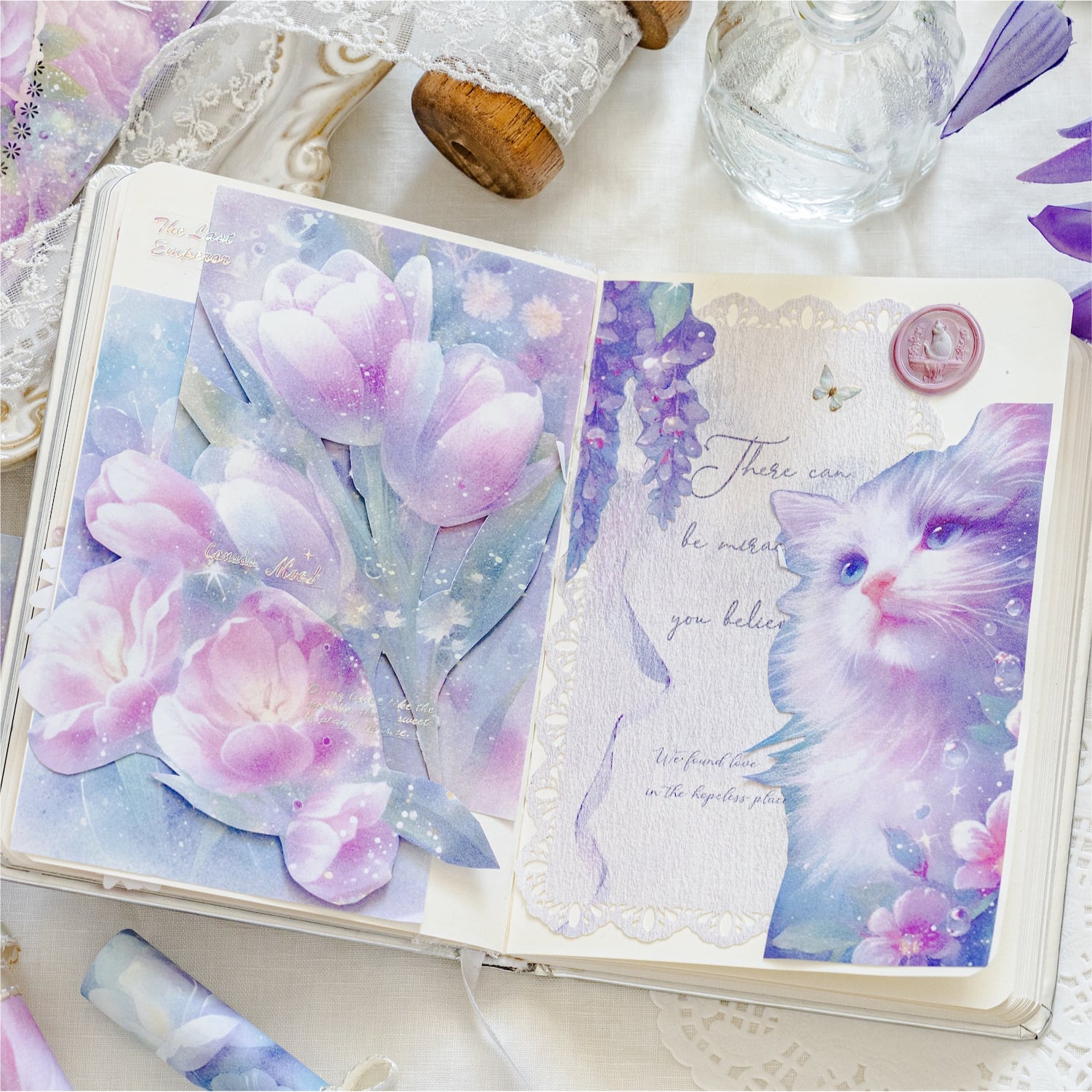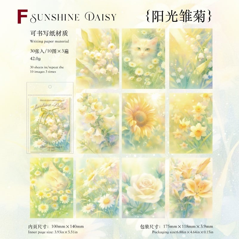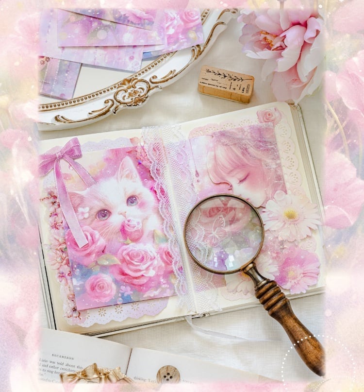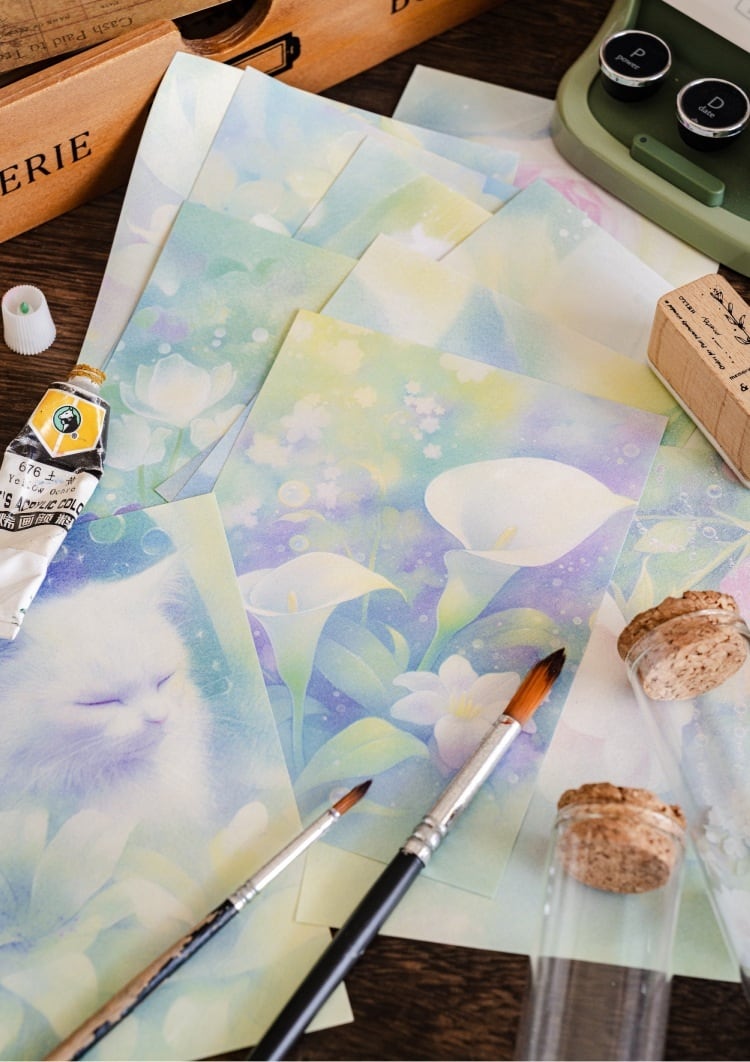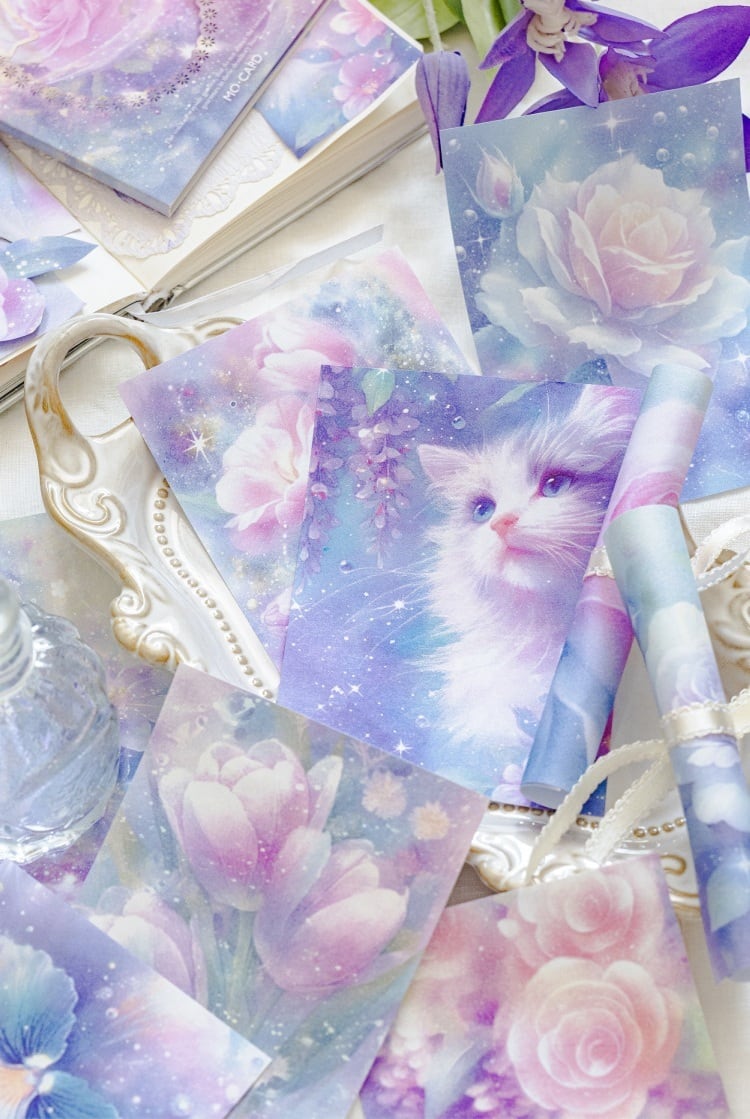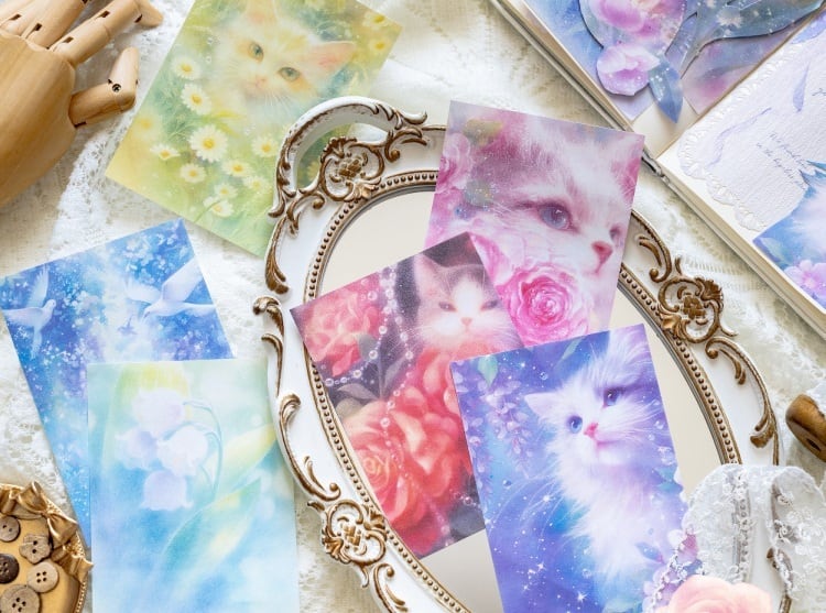 やわらかな光に包まれた花や猫、幻想的なモチーフが広がる素材紙です。淡いグラデーションと繊細な描写が重なり合い、ページ全体にやさしい世界観を添えてくれます。1種類ごとに統一感のあるデザインで構成されているため、組み合わせるだけで自然なコラージュに仕上がります。手帳デコやコラージュ素材としてはもちろん、ラッピングやお手紙のアクセントにも取り入れやすく、ふんわりとした雰囲気づくりにおすすめです。