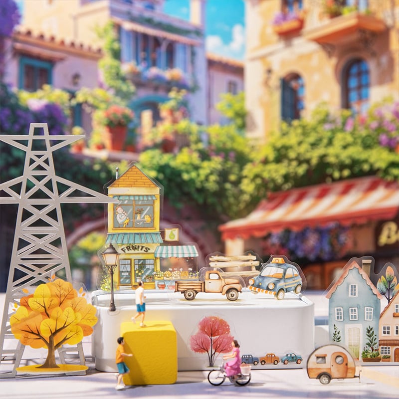 やさしい色合いで描かれた小さな町の風景を詰め込んだシールブックです。家やお店、車や街路樹などのモチーフが揃い、ページごとに統一感のある街並みが広がります。1ページずつ切り離して使えるため、手帳デコやコラージュ素材として自由に配置しやすく、日常の記録や旅のイメージづくりにもぴったりです。建物や風景モチーフを中心にしたデザインで、ナチュラルで温かみのあるページ作りを楽しめます。