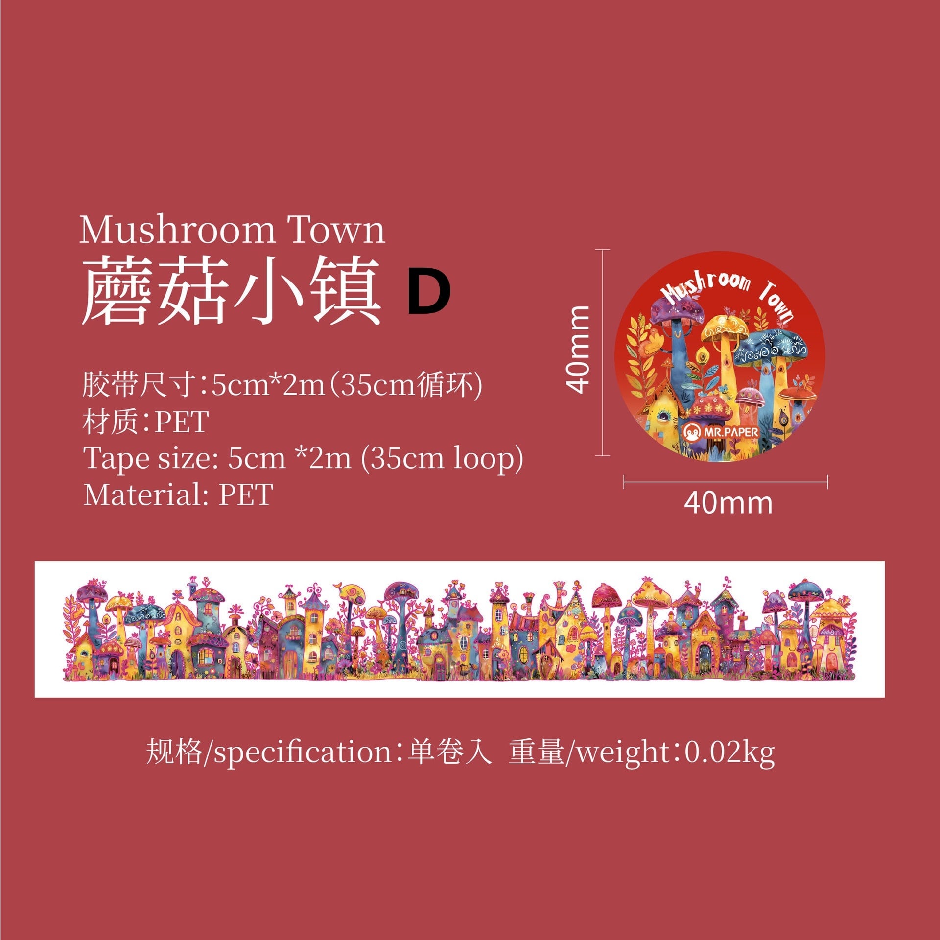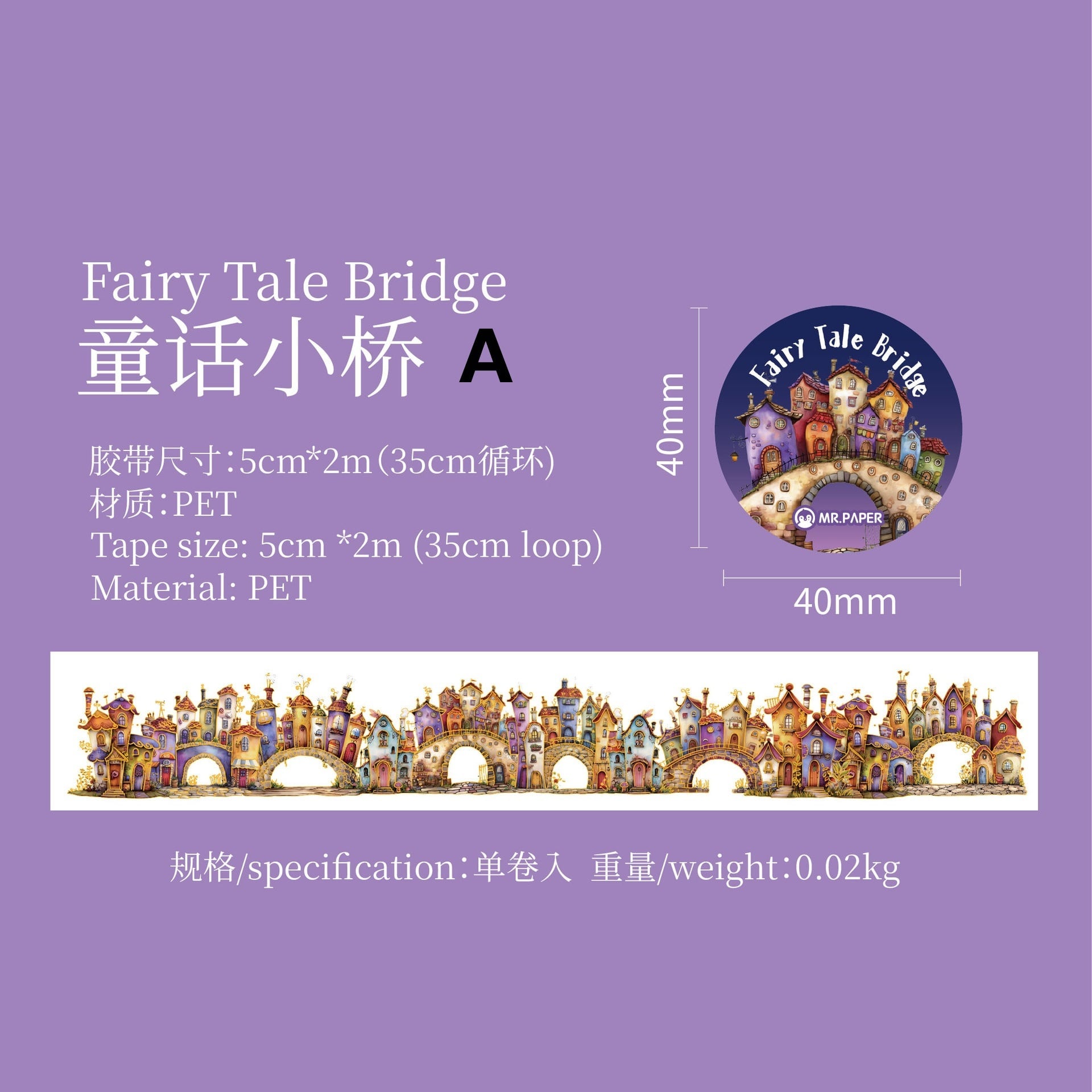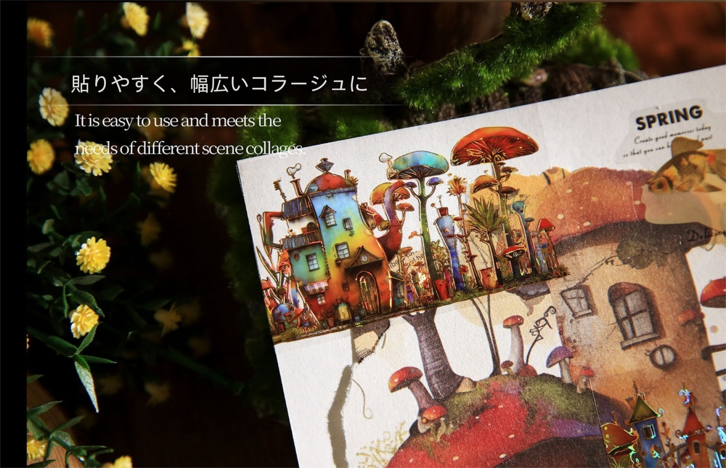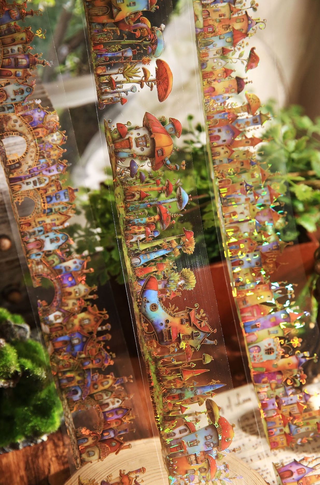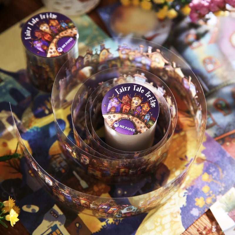 童話の中に迷い込んだような、やわらかく幻想的な街並みを描いたマスキングテープ。小さな家々が連なる橋や、きのこが広がる不思議な風景、彩り豊かな城のデザインが続き、ひと貼りするだけでページに物語のような広がりが生まれます。幅のあるテープなので背景づくりにも使いやすく、コラージュ素材として空間をやさしく埋めながら、自然な奥行きを演出できる仕上がり。手帳デコやジャンクジャーナル、アルバム装飾にも取り入れやすく、重ねて貼ることでさらに表情の変化も楽しめます。海外文具ならではの繊細な色合いとファンタジーな世界観を、日常のデコレーションにさりげなく取り入れたい方におすすめです。
