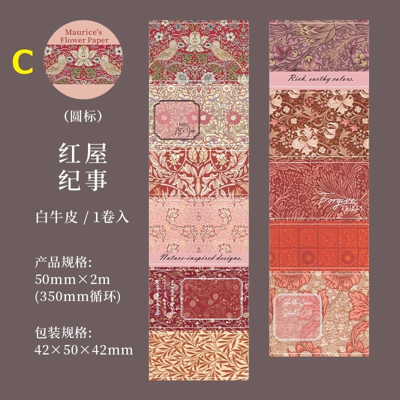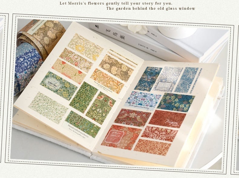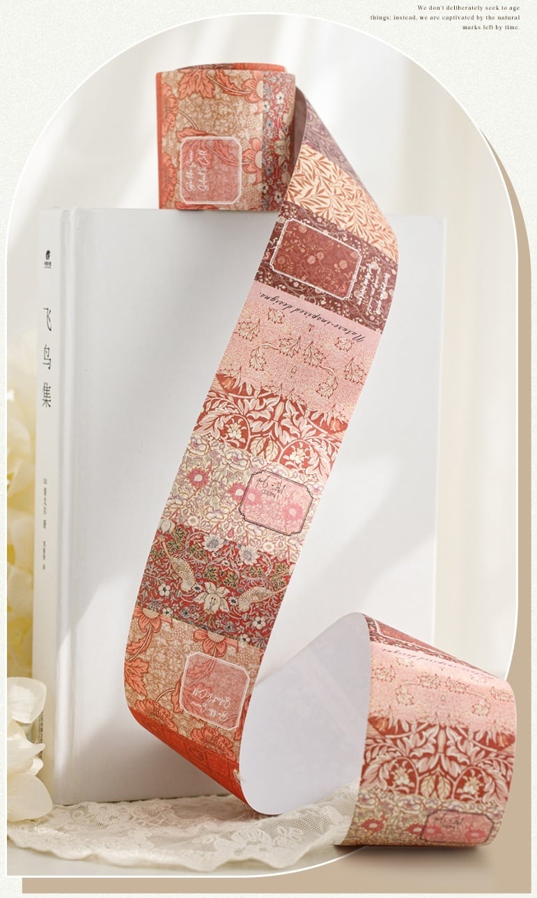 クラシックな壁紙のような繊細なボタニカル模様が連なるロールシールです。草花や蔦模様、装飾フレームが落ち着いた色合いで描かれ、ページにさりげない品のある雰囲気を添えてくれます。1枚ずつ切り取って使えるデザインが続くため、コラージュ素材として背景づくりにもポイント使いにも取り入れやすく、手帳デコやジャンクジャーナルにも自然に馴染みます。白牛皮紙ならではのやわらかな質感が特徴で、貼り重ねても違和感が出にくく、紙もの同士の相性も心地よくまとまります。アンティーク調やナチュラルな雰囲気を大切にしたコラージュを楽しみたい方におすすめです。