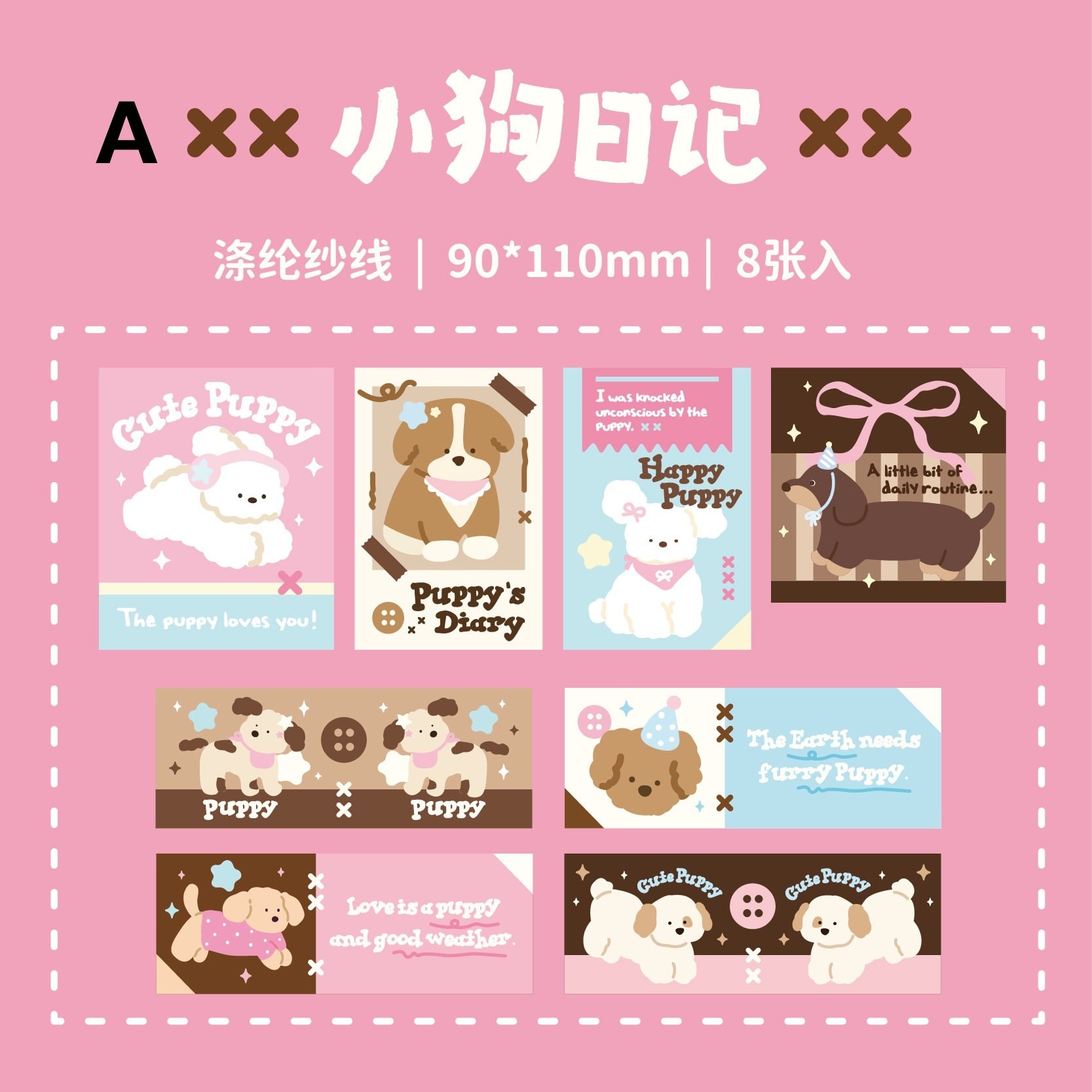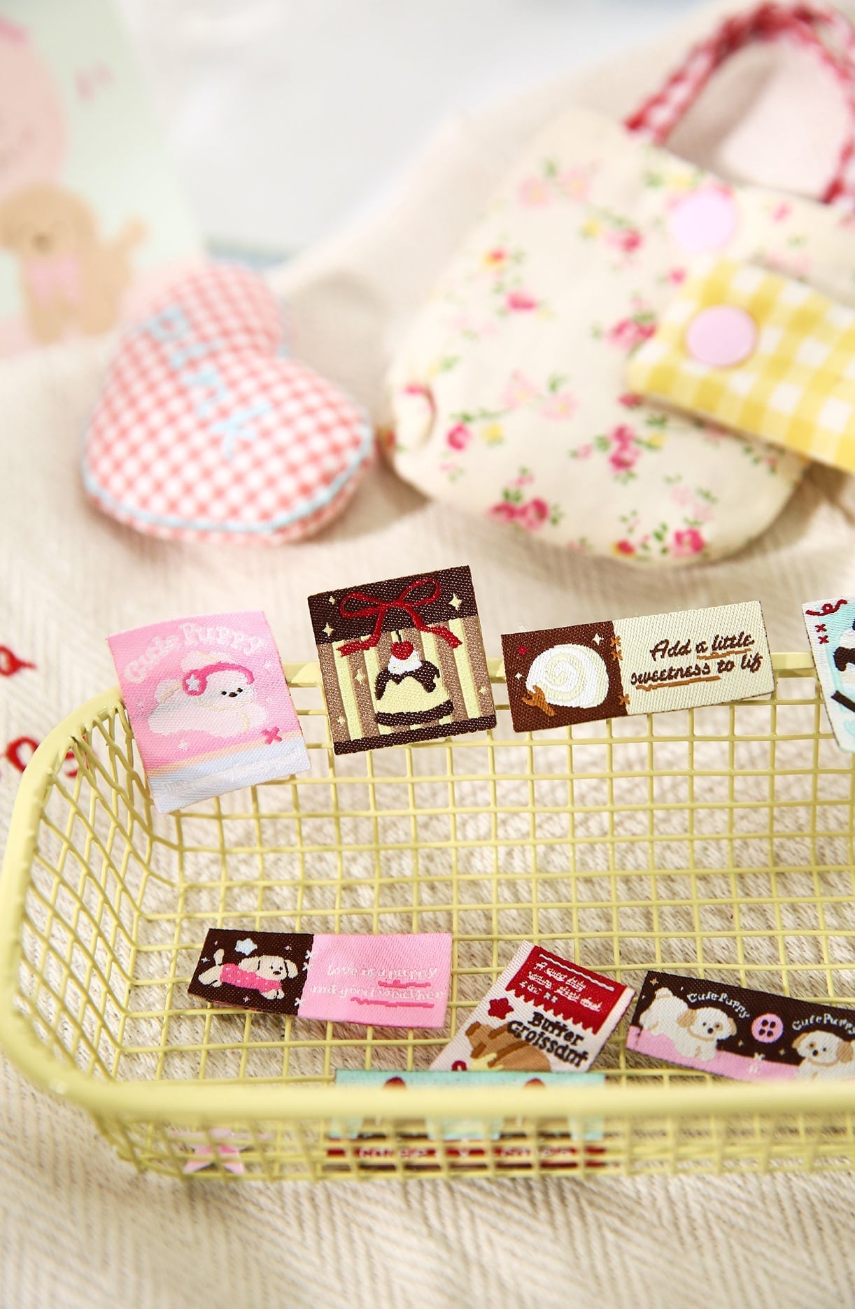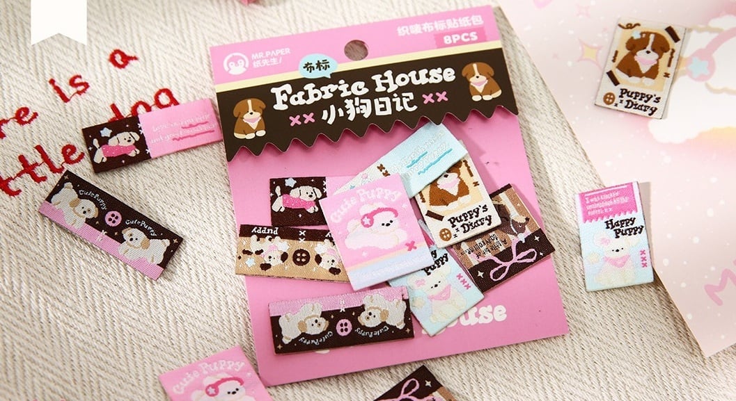 やわらかな雰囲気のわんちゃんやスイーツを描いた、タグ風デザインのシールです。小さなラベルのようなサイズ感で、手帳やコラージュにさりげなくアクセントを添えてくれます。表面は布のような質感を感じられる素材で、一般的な紙やPETとは異なる、少し立体感のあるやさしい風合いが特徴です。刺繍のようなあたたかみのある表現が、ページ全体をやわらかくまとめてくれる仕上がり。1枚ずつ丁寧に取り入れたい方や、素材感にこだわりたいコラージュ好きの方におすすめです。