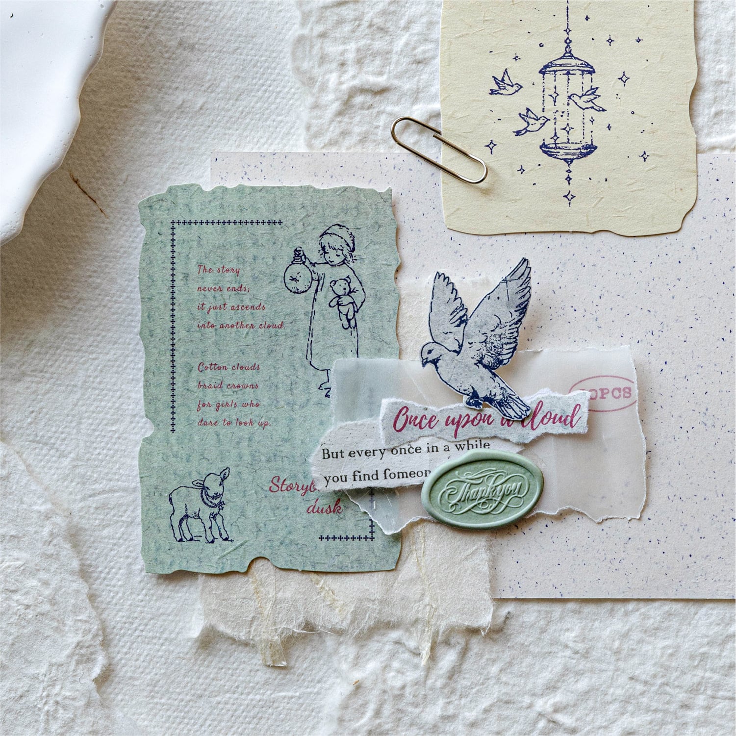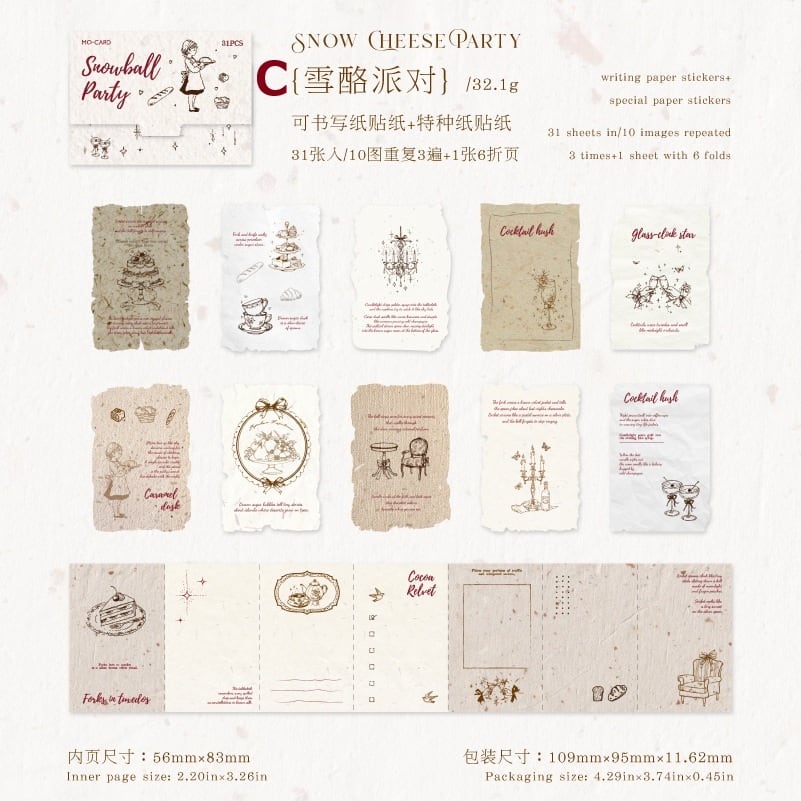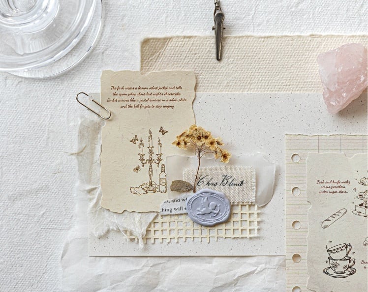 やわらかな紙の質感と繊細なデザインが魅力の紙素材シールです。書き込みができる紙シールと風合いの異なる特殊紙を組み合わせており、ナチュラルで奥行きのある仕上がりが楽しめます。アンティーク調のイラストや文字がページにやさしく馴染み、手帳やノートのデコレーション、コラージュにも自然に取り入れやすいデザインです。重ね貼りや書き込みアレンジもしやすく、落ち着いた雰囲気づくりにさりげなく活躍します。