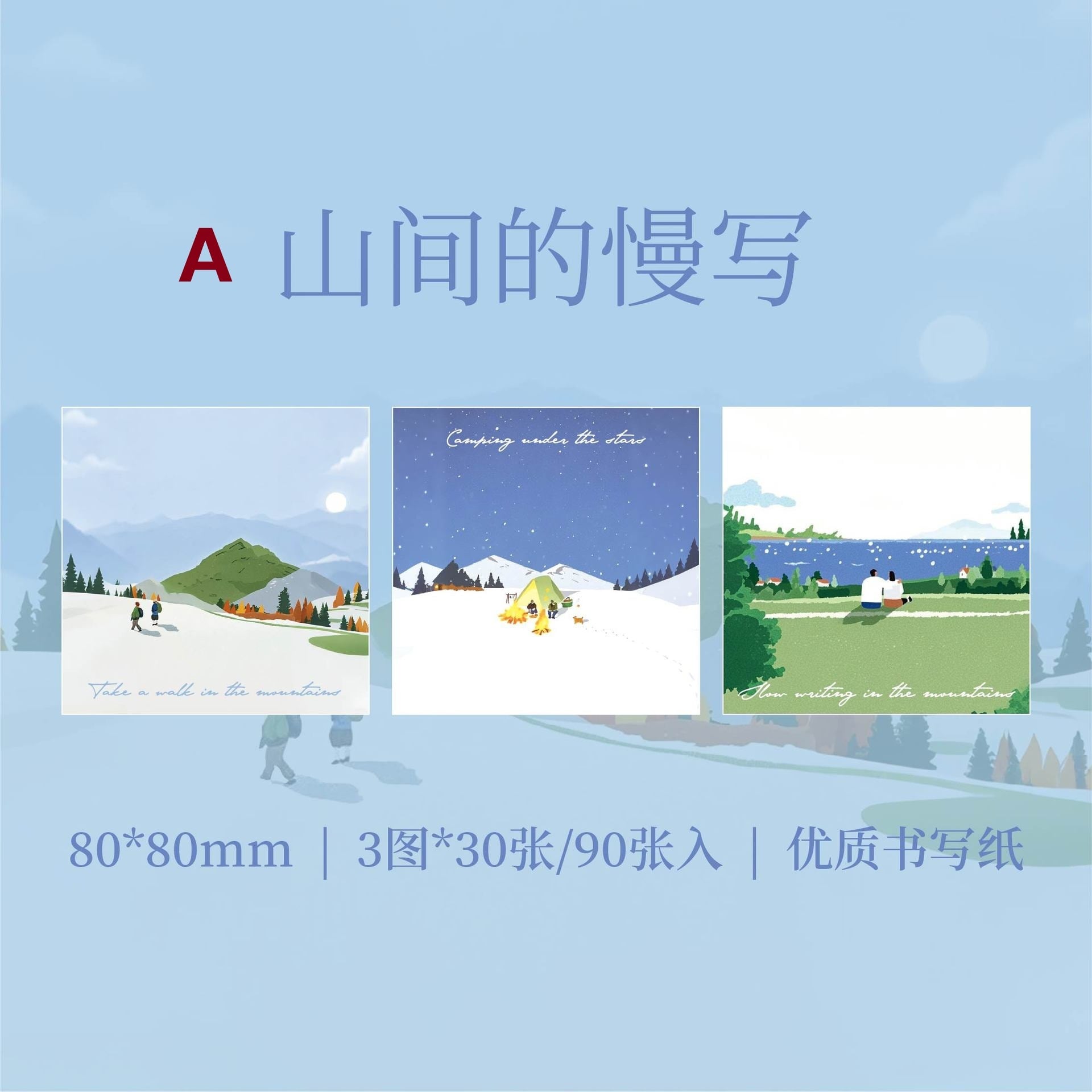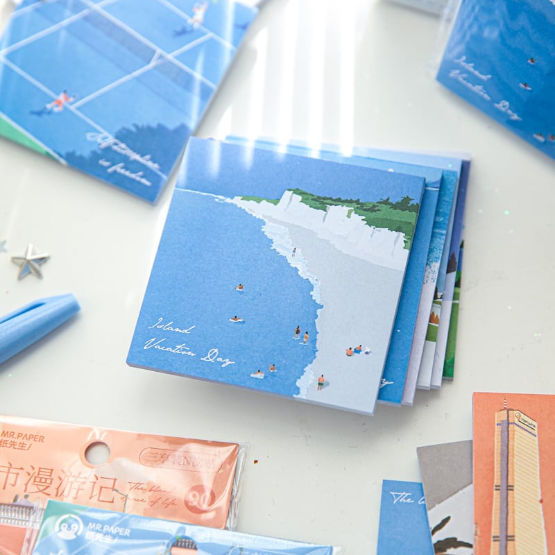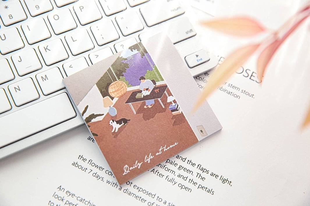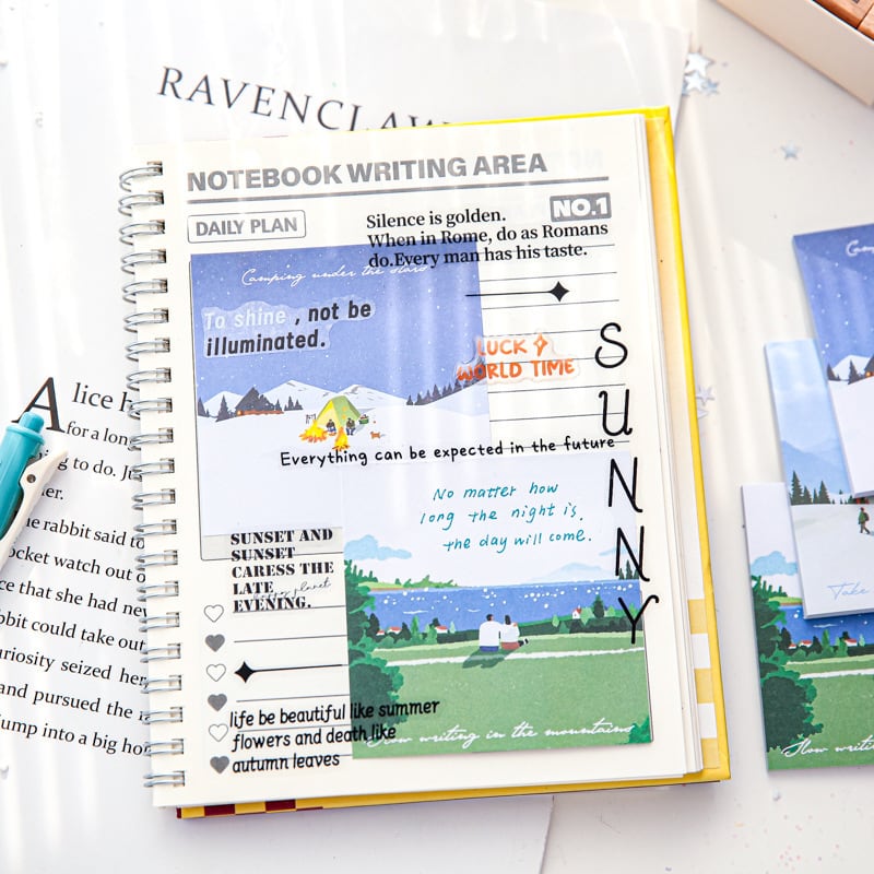 やわらかな色合いで描かれた風景デザインが印象的な付箋です。山や海、日常のワンシーンを切り取ったようなイラストが、手帳やノートにそっと馴染み、ページに静かな彩りを添えてくれます。書き込みしやすい紙質で、メモとして使いながら、手帳デコやコラージュにも取り入れやすい仕上がりです。日々の記録やちょっとしたメッセージにも使いやすく、落ち着いた雰囲気がお好きな方におすすめです。