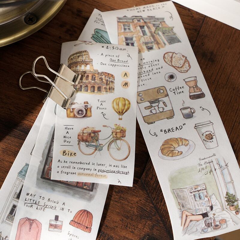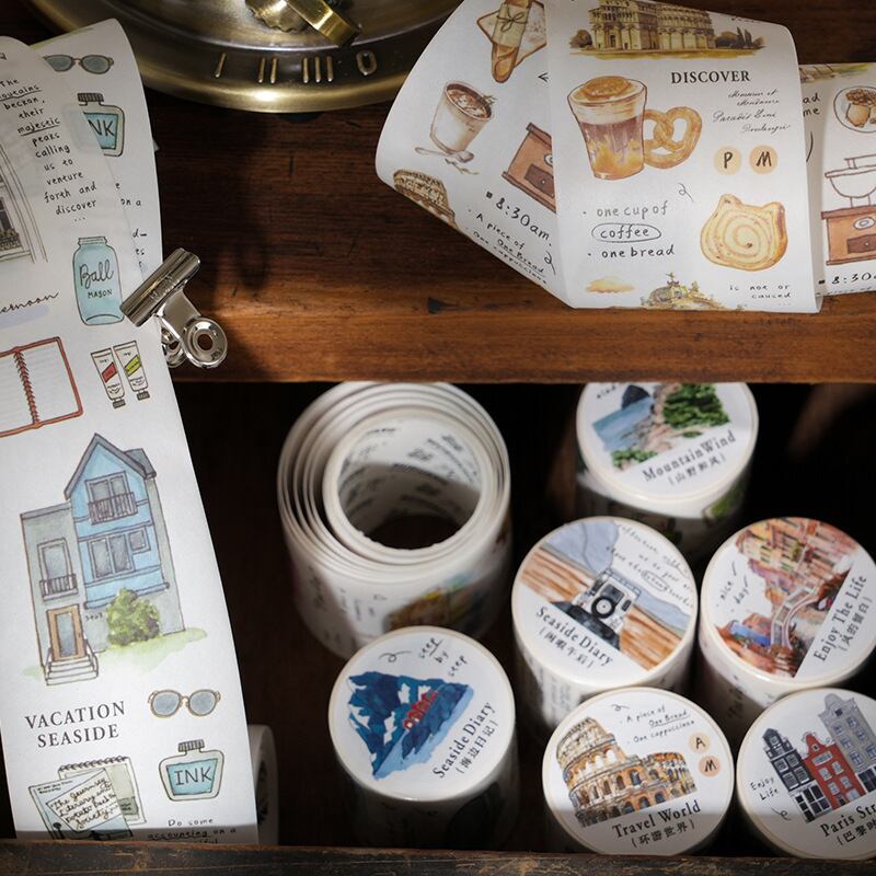 まるで旅行に出かけた気分に浸れるようなデザインが特徴のマスキングテープです。爽やかなカラーリングが、お洒落なコラージュ作品を生み出します。ぜひ自分だけのアートを作り出してみてください。
