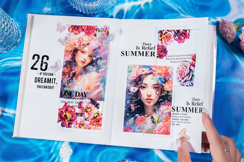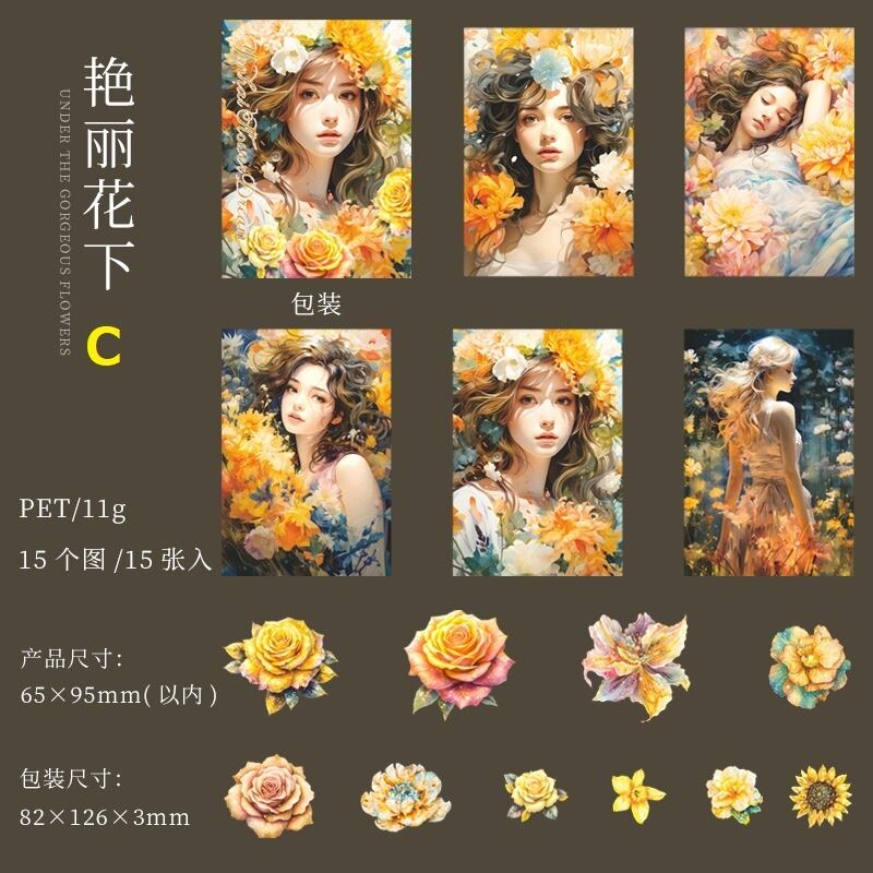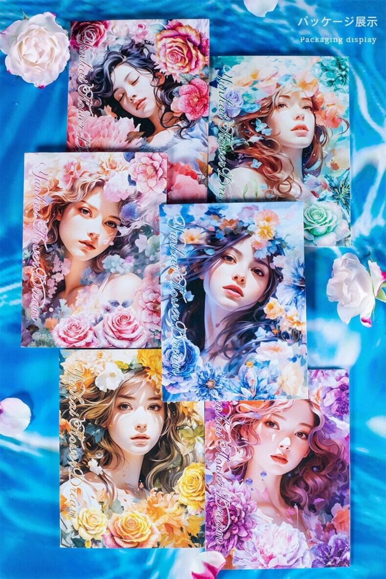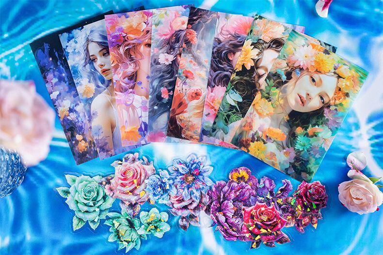 美しい少女と花々が描かれたシールです。鮮やかな色使いと繊細なディテールで、コラージュに華やかさとロマンティックな雰囲気をプラスしてくれます。