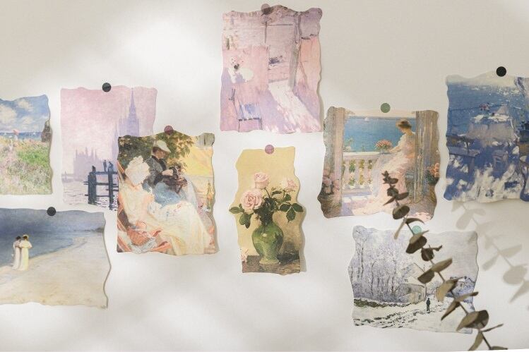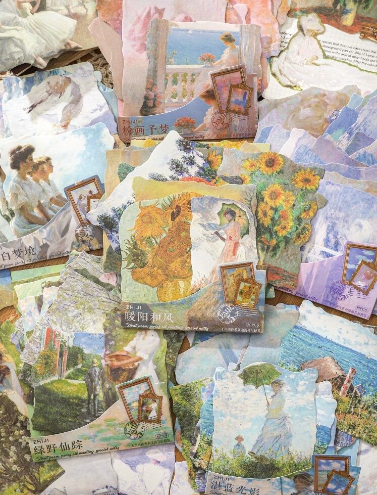 油画デザインを基にした魅力的な素材紙です。メモやコラージュなど多用途に対応しており、あらゆるシーンでご活用いただけます。アートの世界を感じながら、日常に彩りを加える素敵な商品です。