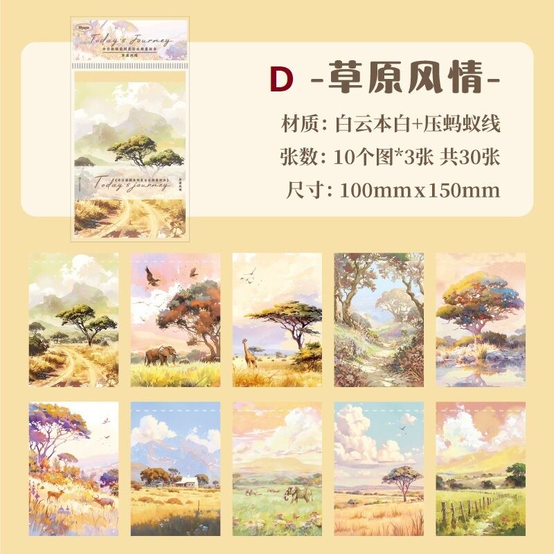 美しい景色が描かれたデザインペーパーです。様々な自然の風景や街並みがコラージュを彩ります。見るたびに心が癒される、とても素敵な商品です。上部に切り取り線が入っていて使いやすさも抜群です。