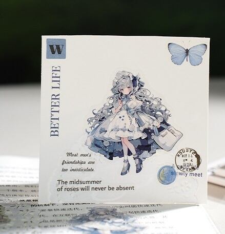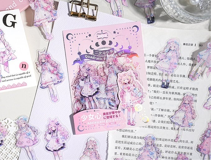 異次元の世界の可愛い少女をテーマにしたフレークシールです。一部立体烫銀加工が施されており、見る角度によって様々な輝きを放ちます。可愛いデザインはコレクションする楽しさも格別です。