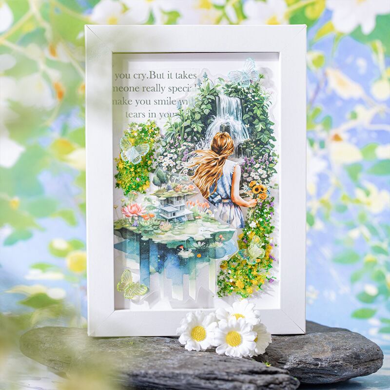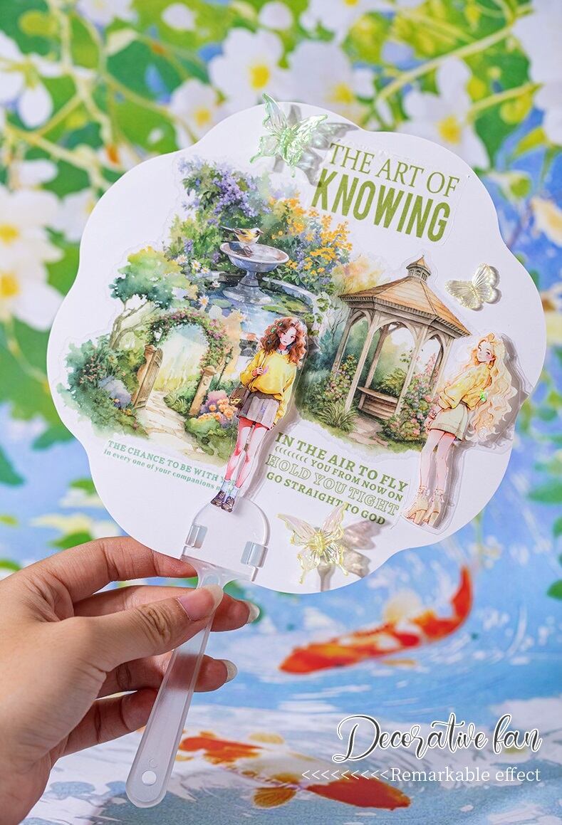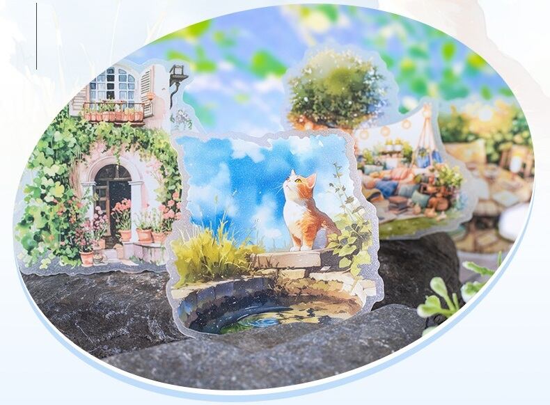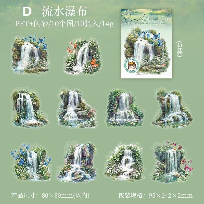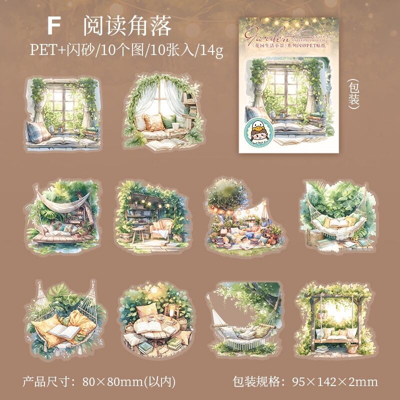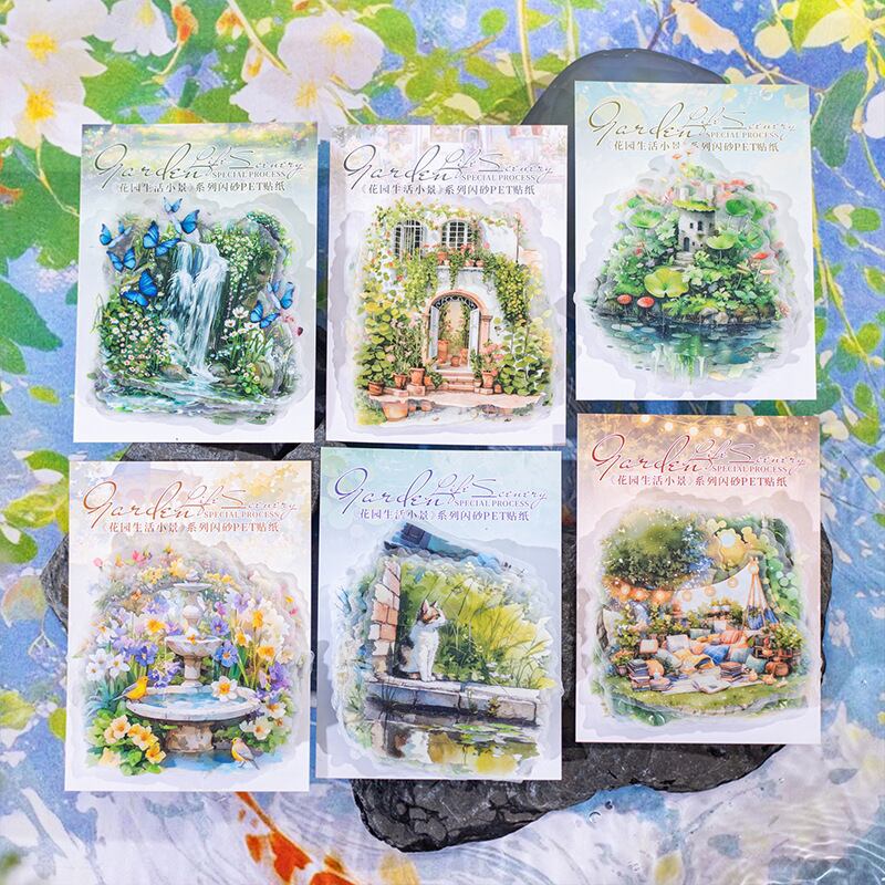 色とりどりの素敵なガーデン風景が描かれたフレークシールです。閃砂PET素材を使用しており、光を受けると細かい粒子が輝いてコラージュを美しく引き立てます。さまざまなアイテムに使えるので、デコレーションの幅が広がります。