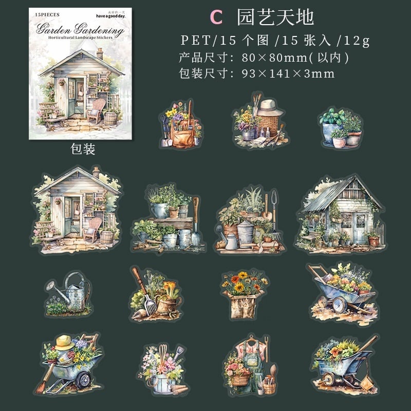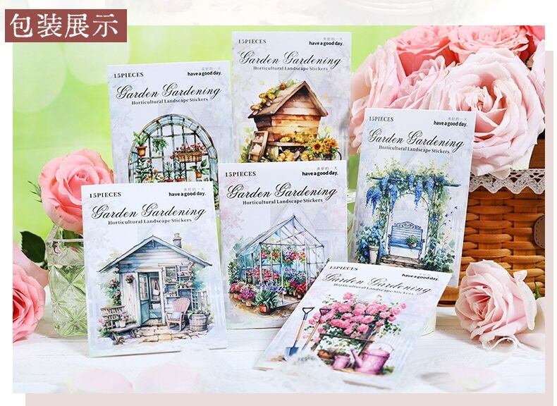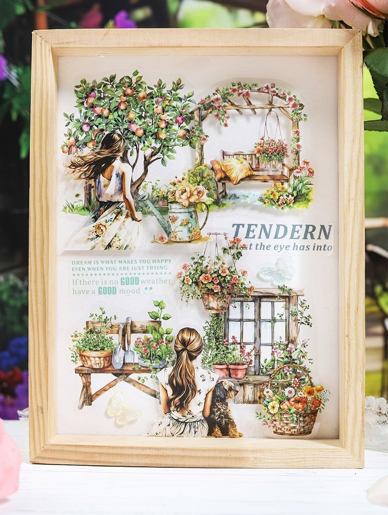 ガーデニングがテーマのフレークシールです。さまざまな植物や花が描かれた美しい色合いのデザインは、コラージュに楽しい空間を作り出し、創造力を引き出してくれること間違いなしです。