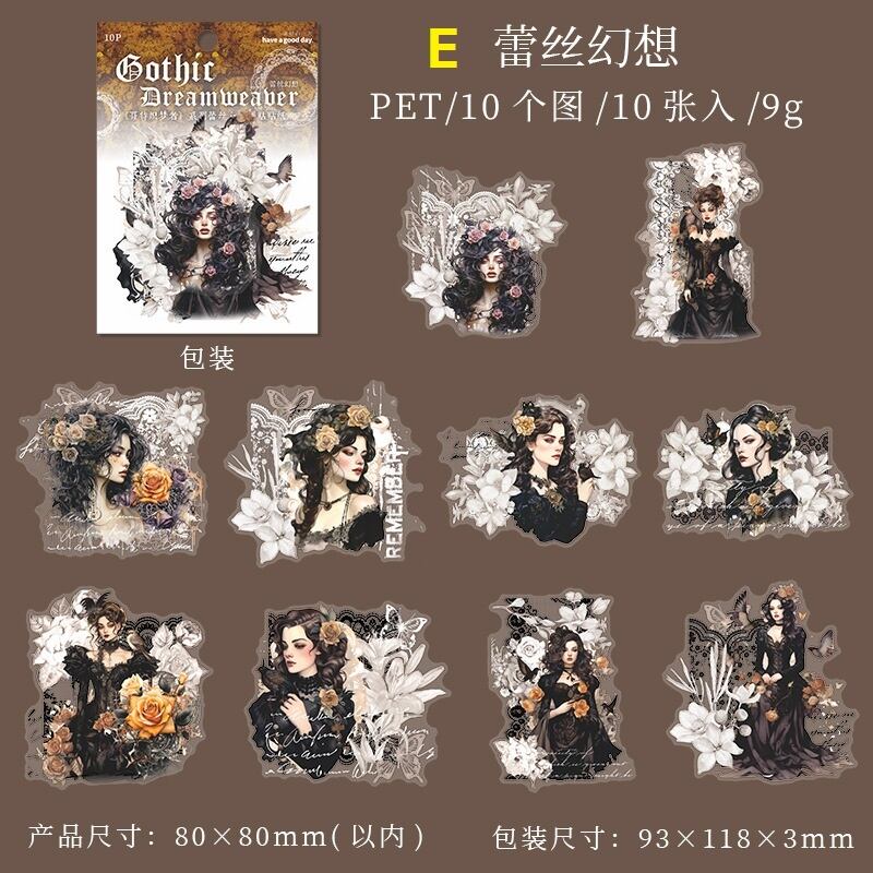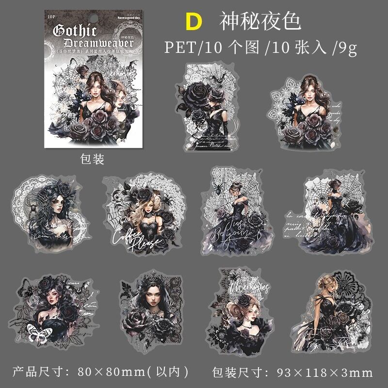 ダークで魅力的なゴシック調のフレークシールです。美しい女性が描かれたデザインは、幻想的で独特の雰囲気を醸し出し、コラージュを際立たせます。